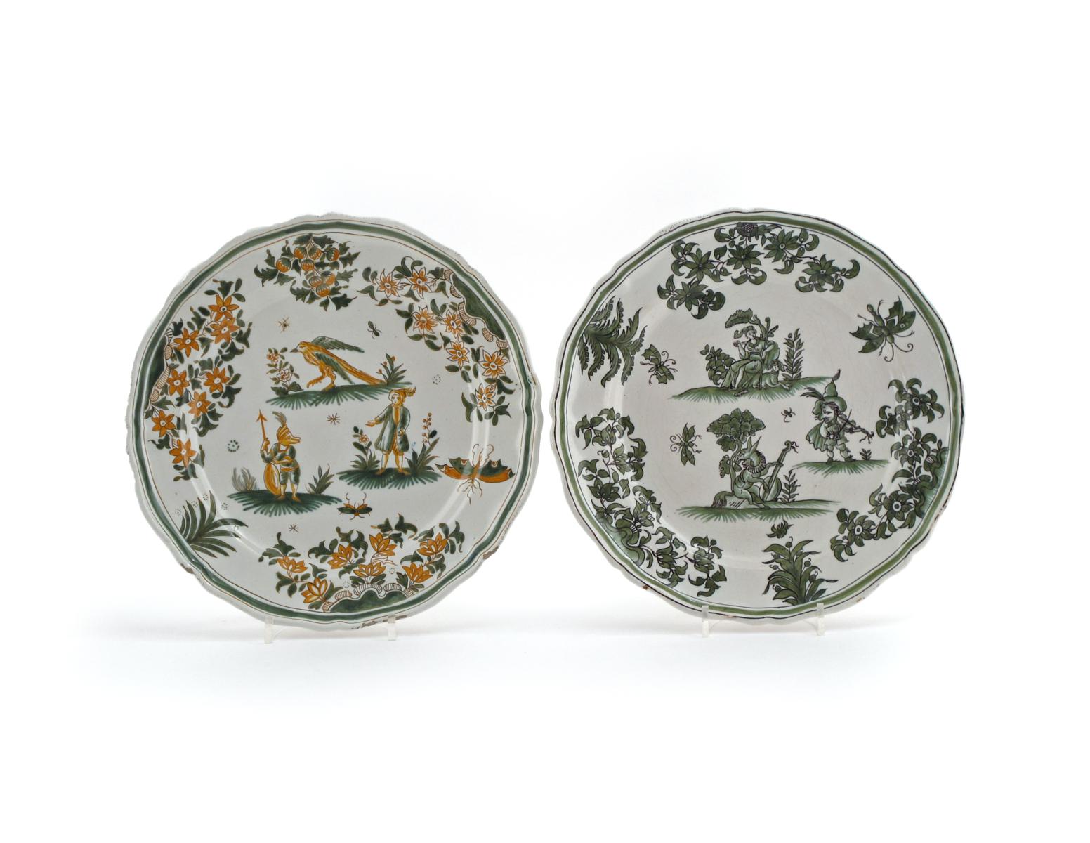 Two Moustiers type faïence plates 19th century, decorated in the Olerys manner with grotesque creatures and mythical animals amidst foliage, in shades of green and ochre, interlaced OL and F marks, 27cm. (2)