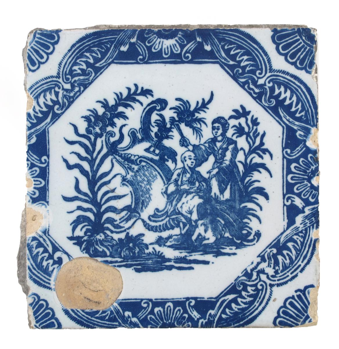 A Liverpool delftware woodblock-printed tile c.1756-7, decorated in blue by John Sadler with two Chinese figures among rococo scrolls and plants, the border with foliate scrolls and flowerhead mon, some glaze chips, 12.7cm.