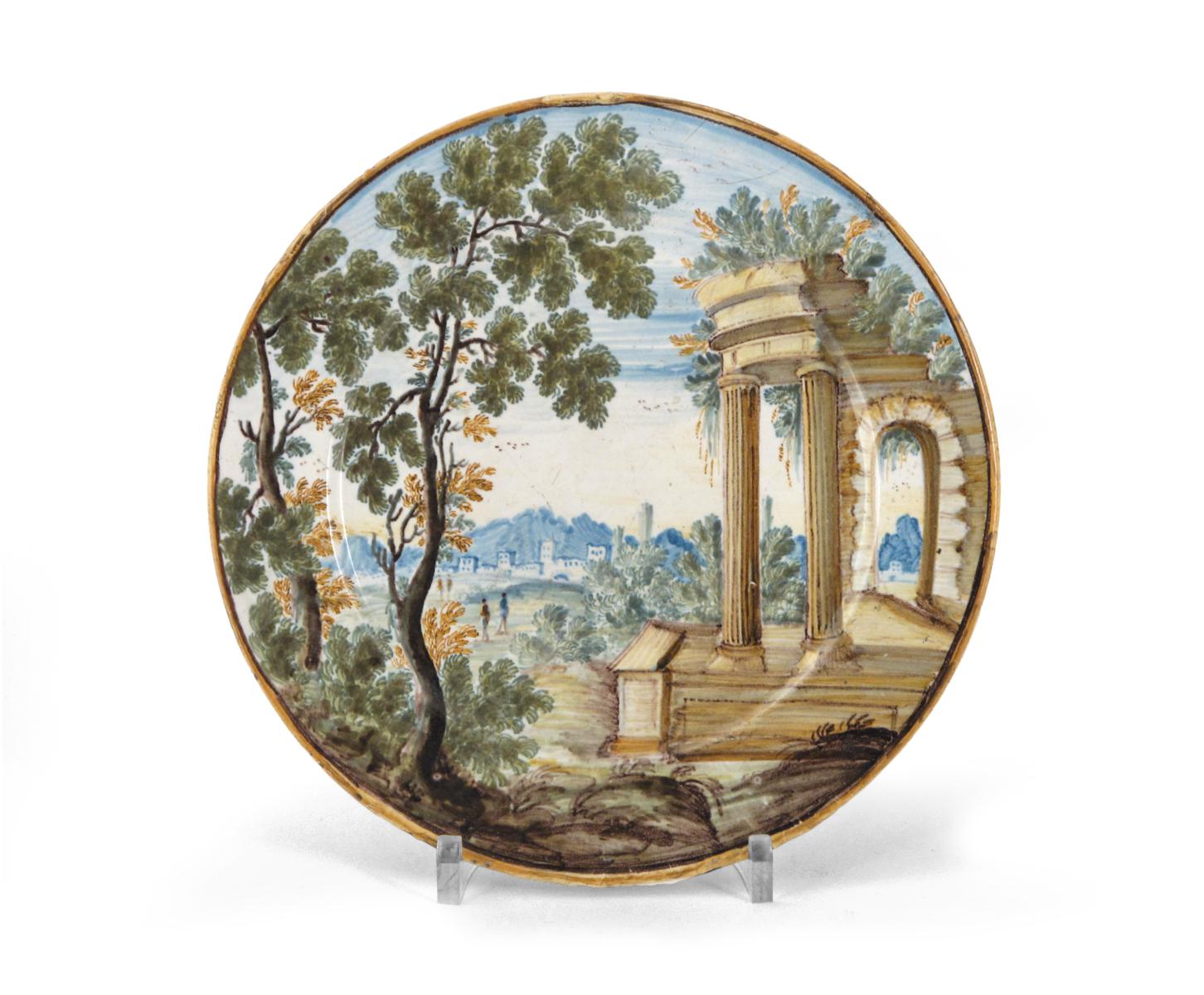A small Castelli maiolica plate mid 18th century, painted with distant figures before a turreted bridge, with overgrown Classical ruins and tall trees to the foreground, 18.2cm.