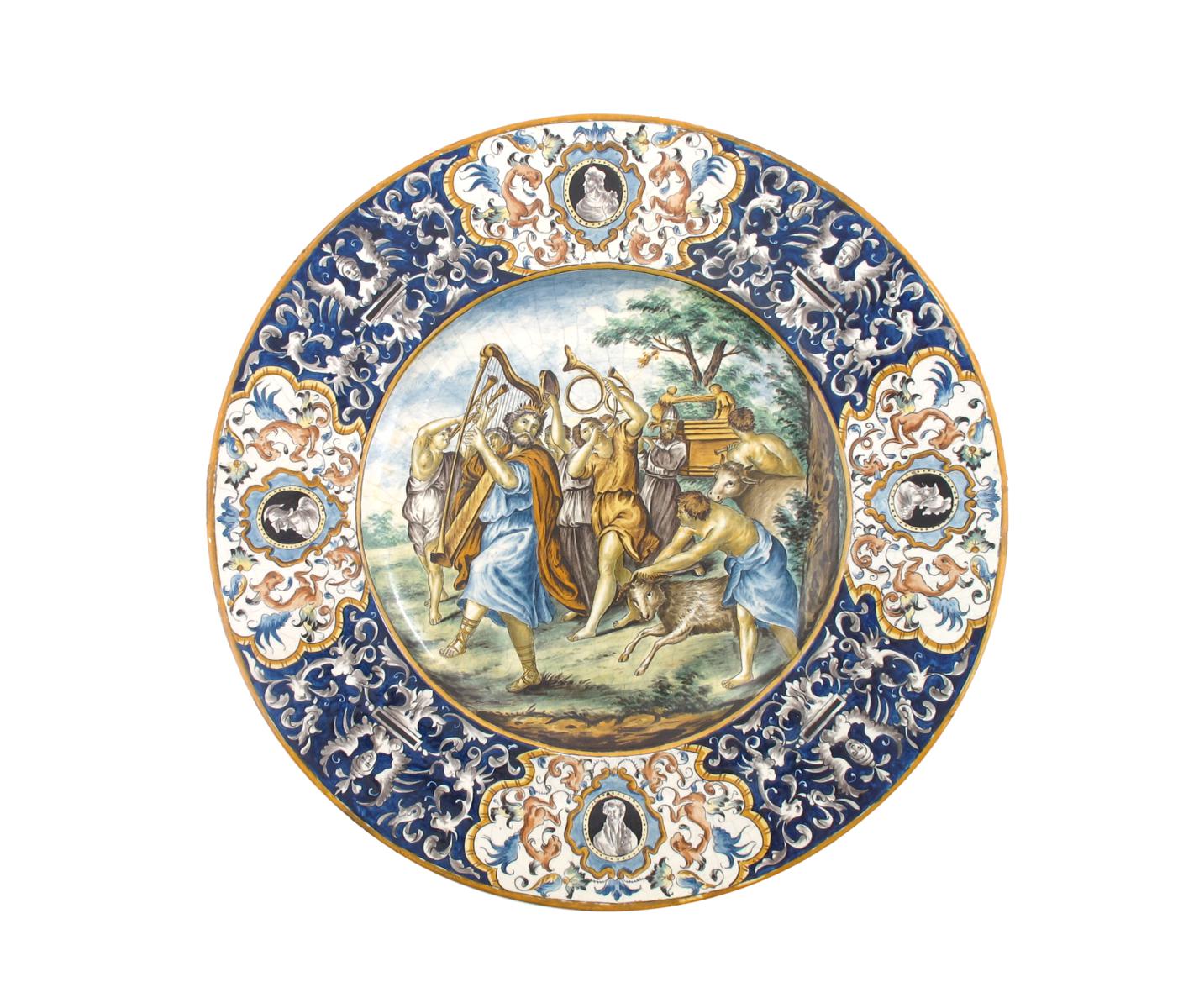 A massive Italian maiolica charger 19th century, the well painted with a crowned figure playing the harp with further revellers behind, the wide rim with four monochrome portraits reserved on a ground of maskheads, mythical beasts and foliate scrolls, one portrait unusually of a man in early 19th century dress, the reverse with the letters FE, GB and N in blue, 63cm.