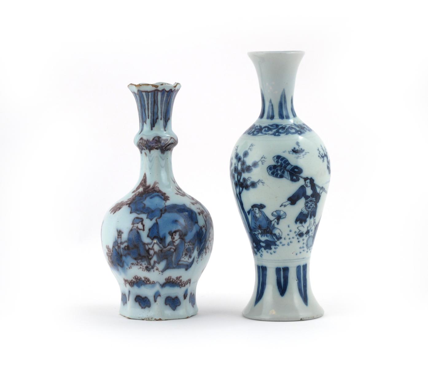 Two Delft vases probably 18th century, one with a knopped neck and painted in blue and manganese, the other baluster shaped and painted in blue, both with Chinese figures in landscapes, some restoration, 24cm max. (2)