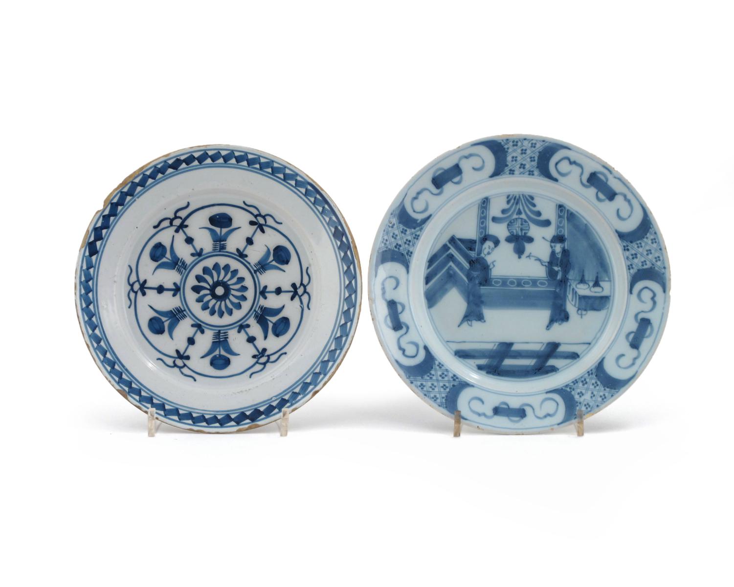 Two delftware blue and white plates mid 18th century, one well painted with two Chinese figures in an interior beside a hanging lantern, the rim with a pattern of tied scrolls, the other with a stylized flowerhead design containing further flowers, 22.7cm max. (2)