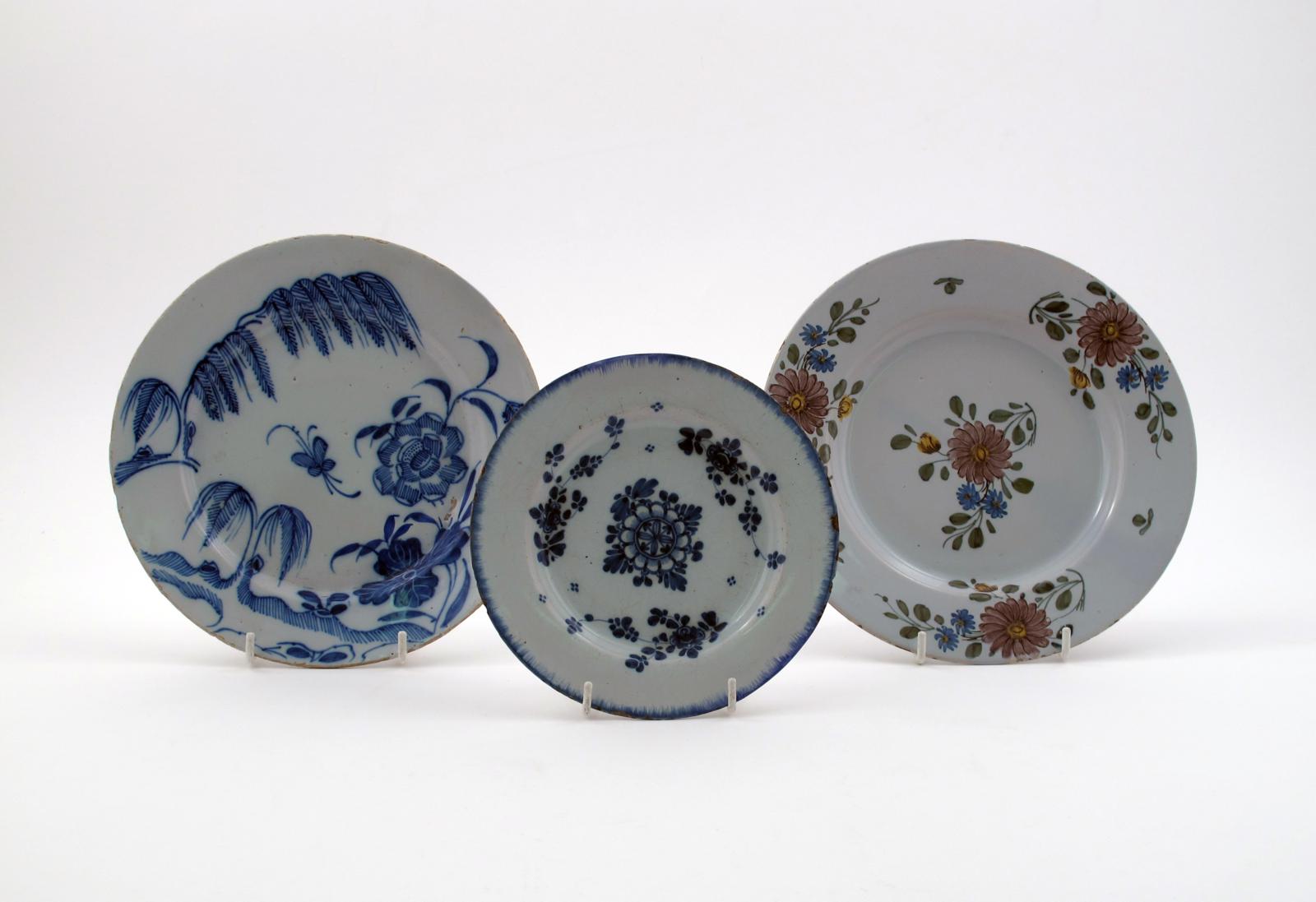 Three delftware plates 2nd half 18th century, one probably Bristol and painted in polychrome enamels with four simple flower sprays, one decorated in a bright blue with a flying insect below weeping willow, the last of small size and decorated with a stylized floral design, some good restoration, 23cm max. (3)