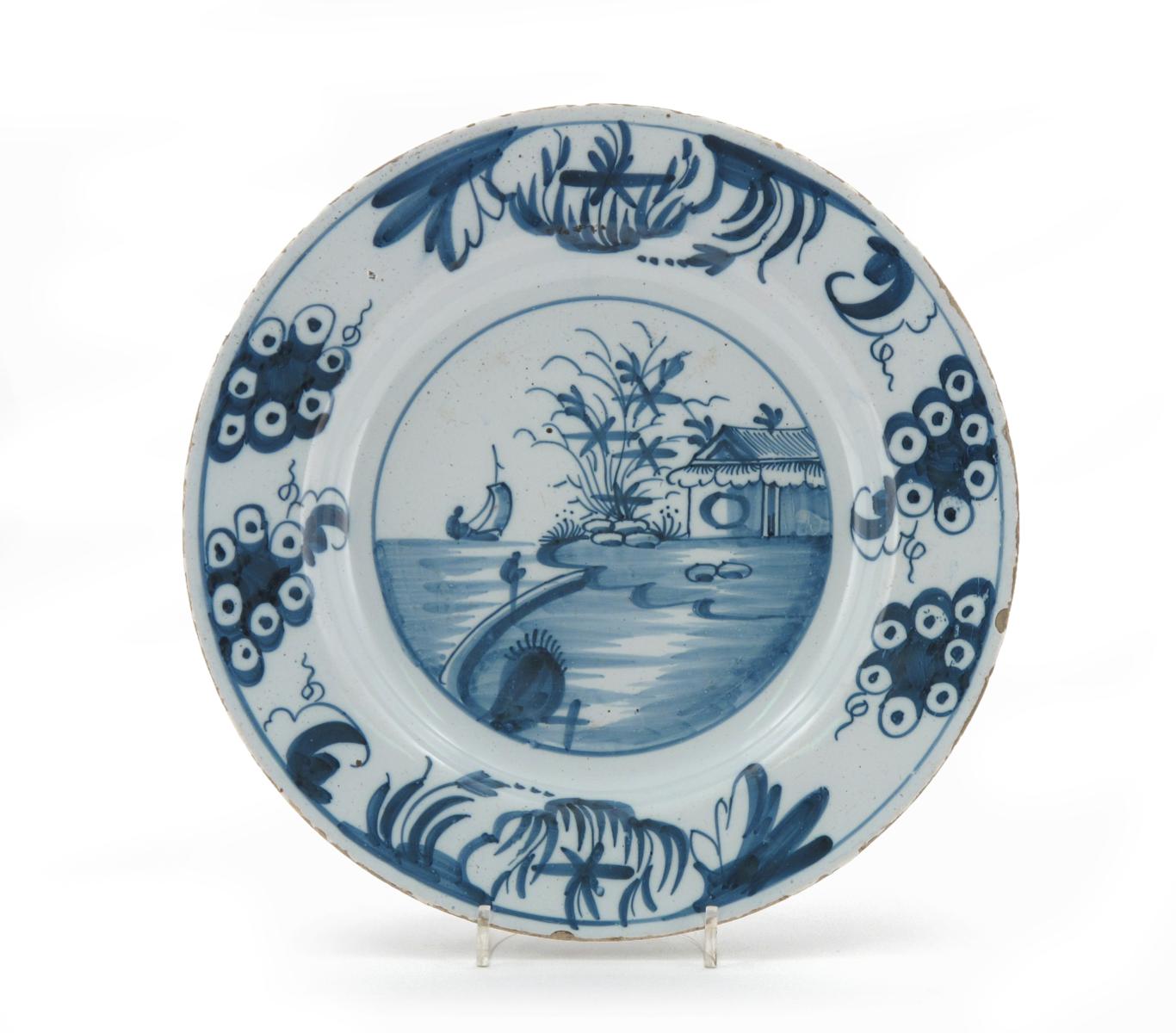 A rare Glasgow delftware plate c.1760, painted in blue with a boat at sail before a small building, the rim with leaves and grapes, 24cm.