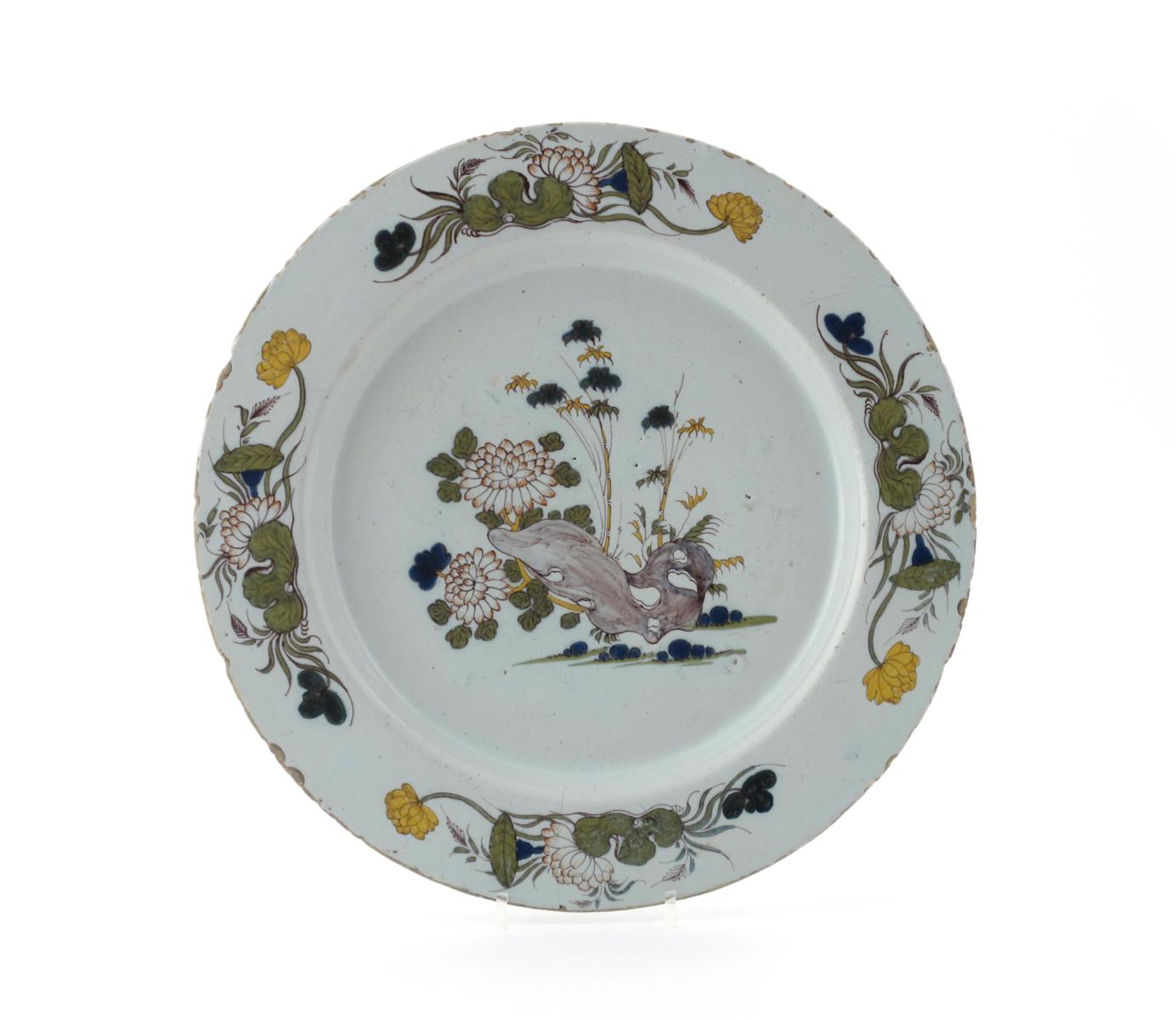A large delftware plate mid 18th century, probably Liverpool, painted in the Fazackerley palette with chrysanthemum and bamboo issuing from behind rockwork, the rim finely painted with sprays of lotus, 36.7cm.