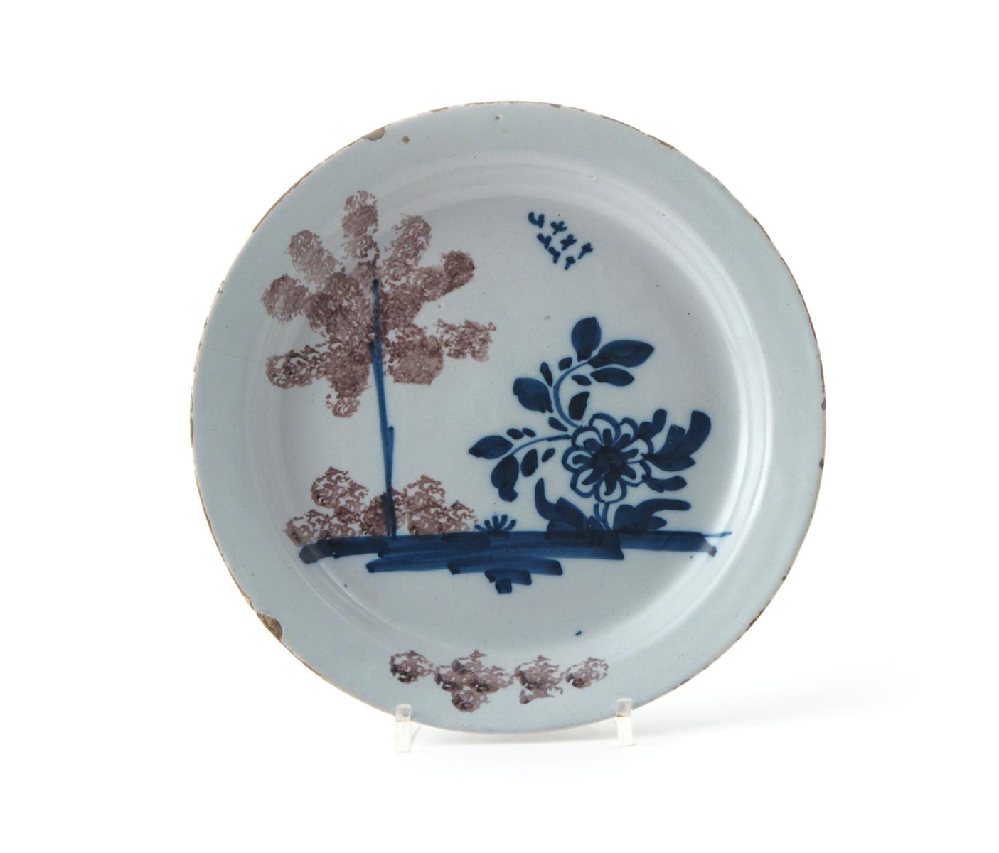 A Bristol delftware plate c.1740, decorated with a small flock of birds in flight above a manganese sponged tree and a large blue flower, some good restoration to the rim, 22cm.