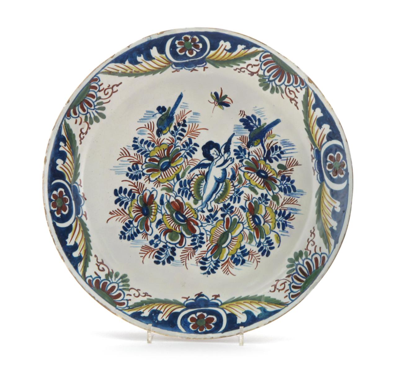 A Bristol or London delftware charger c.1705, decorated in polychrome enamels with a putto and two birds amidst dense flowering branches, the rim painted with wing-like motifs and half flowerheads, a border of crosses and circles to the reverse, restored, 33.5cm.