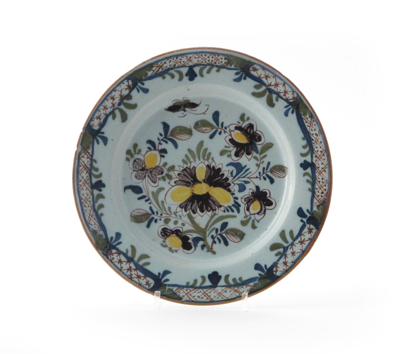 A Lambeth delftware plate c.1780, decorated in an unusual polychrome palette with a flying insect above a central peony spray, the rim with diaper panels, some good restoration to the rim, 23cm.