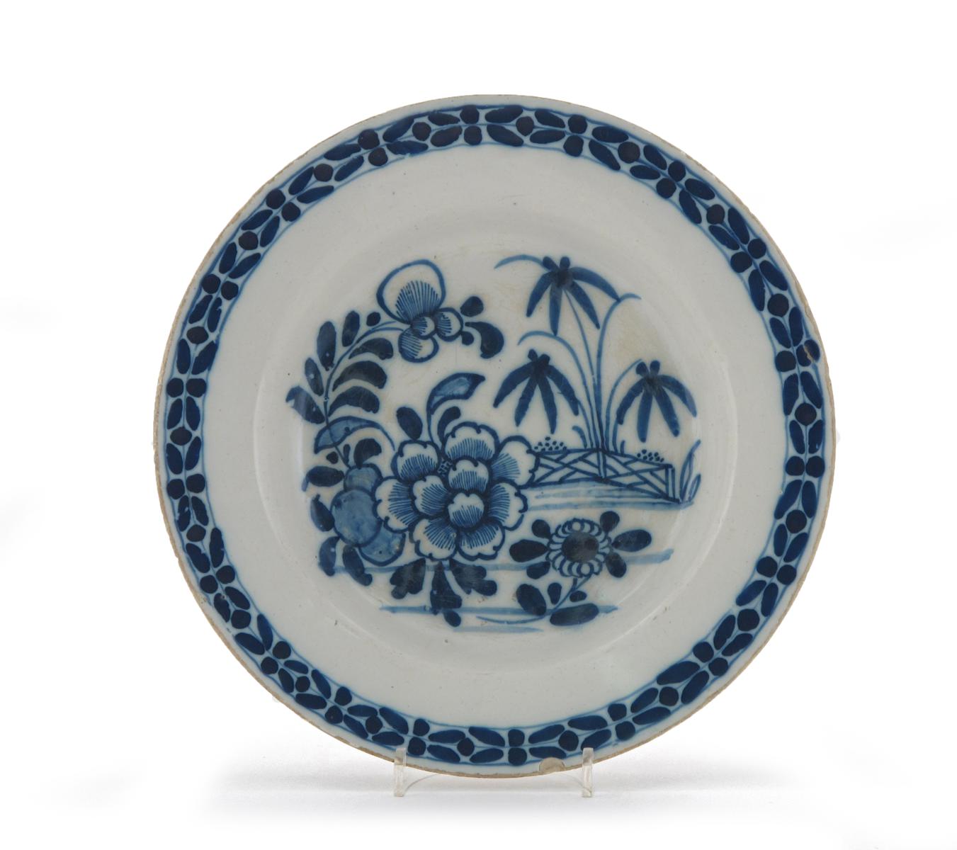 A rare Dublin delftware plate mid 18th century, painted in blue with the Bamboo Fence pattern, a large peony before bamboo issuing from behind a fence, painted 7 mark to the reverse, 24cm.