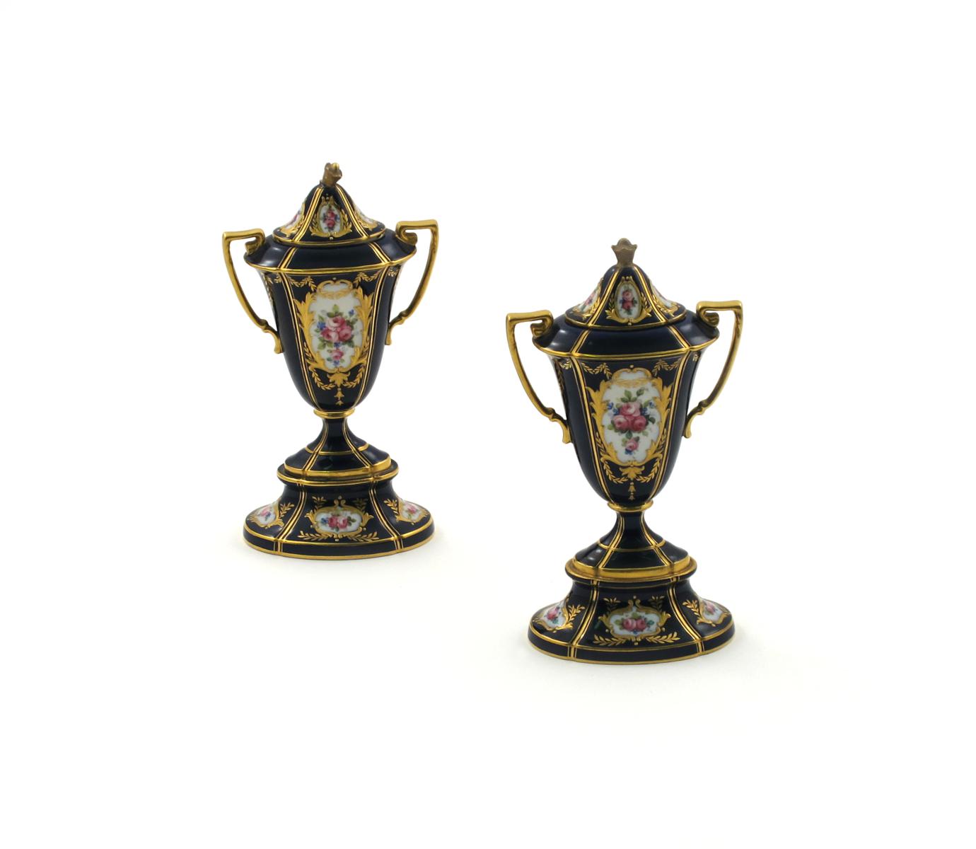 A pair of Minton vases and covers early 20th century, the flattened quatrefoil forms painted with panels of pink roses reserved on a dark blue ground, printed marks, some damage to the covers, 19.5cm. (4)