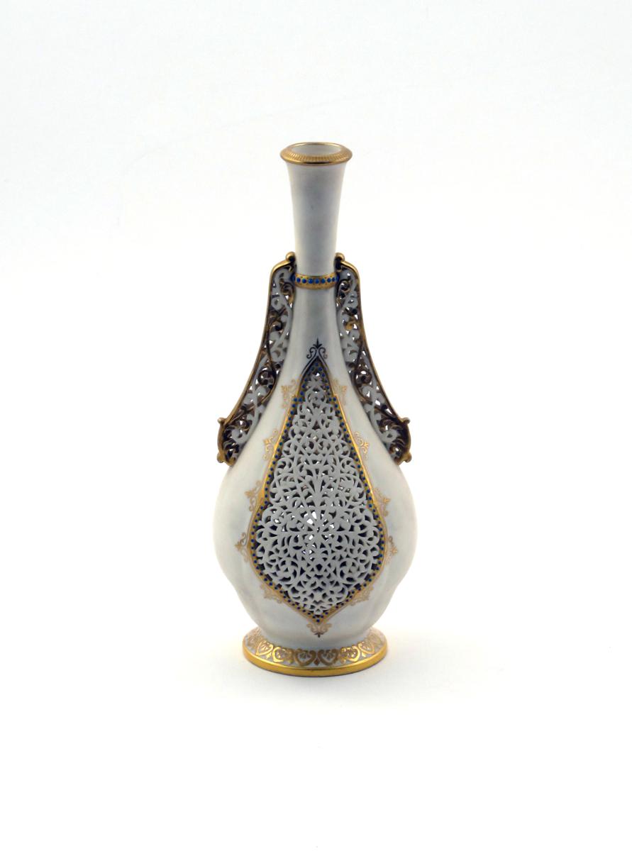 A Grainger's Worcester reticulated vase late 19th century, of Islamic shape, probably by Alfred Barry, pierced to two sides with a panel of elaborate leaf scrolls within a blue jewelled border, some good restoration to the neck, 30cm.