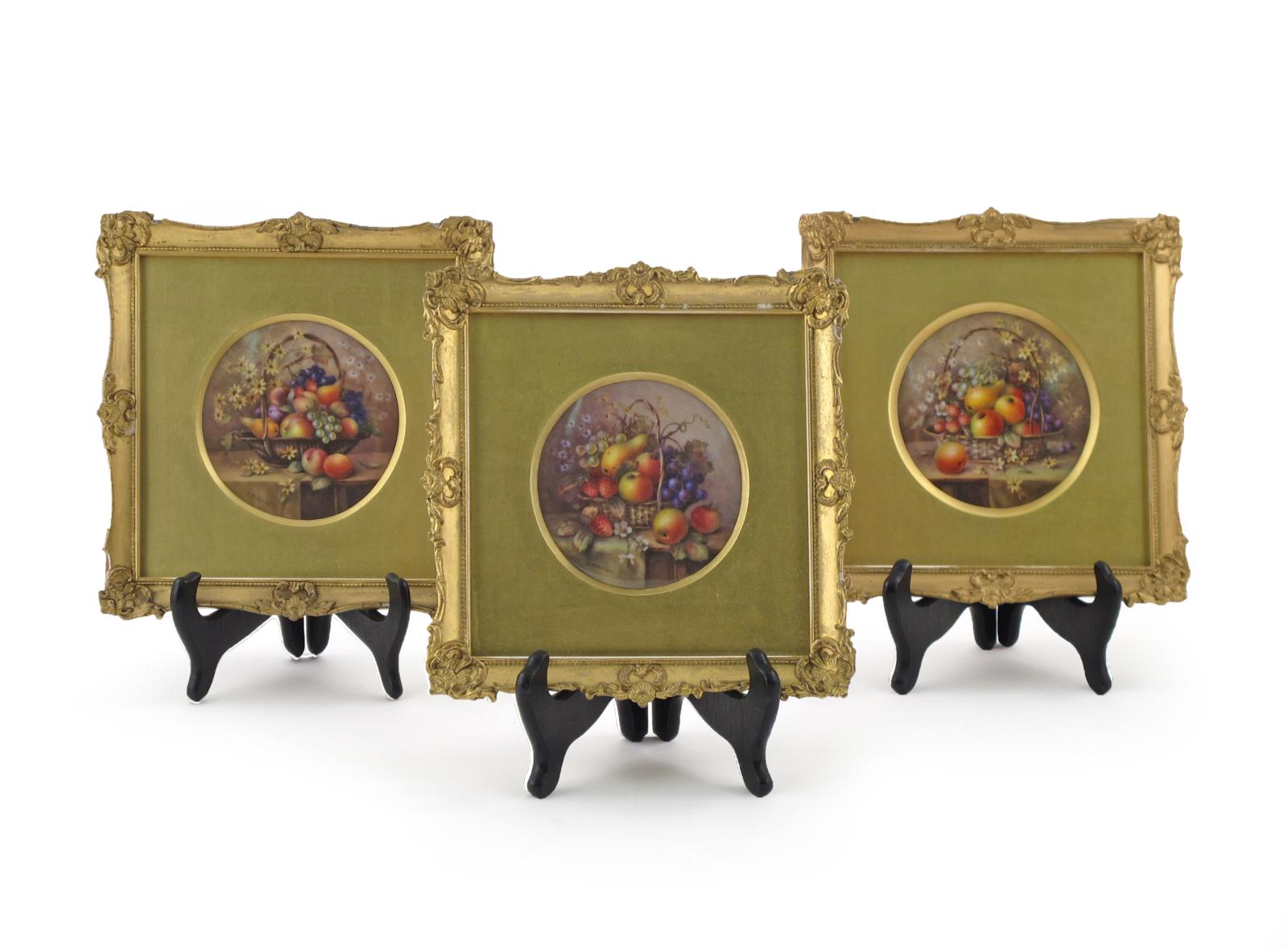 Three good Royal Worcester circular plaques c.1914-18, painted by Richard Sebright with baskets of fruit and flowers spilling over onto tabletops, signed, date codes for 1914 and 1918, framed and glazed, the plaques 10cm dia. (3)