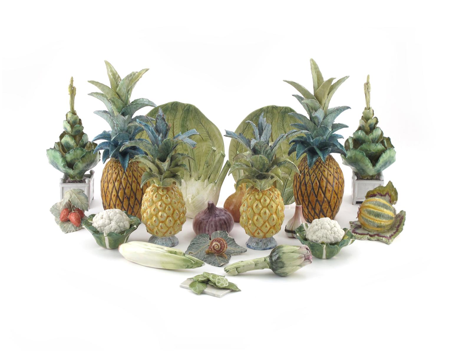 A large group of ceramic trompe l'oeil models of fruit and vegetables 20th century, in pottery and porcelain, several pieces with monograms for Lady Anne Gordon, Dowager Marchioness of Aberdeen, including cauliflower boxes, strawberries, pineapples, an onion and an artichoke, some damages, 30cm max. (22)