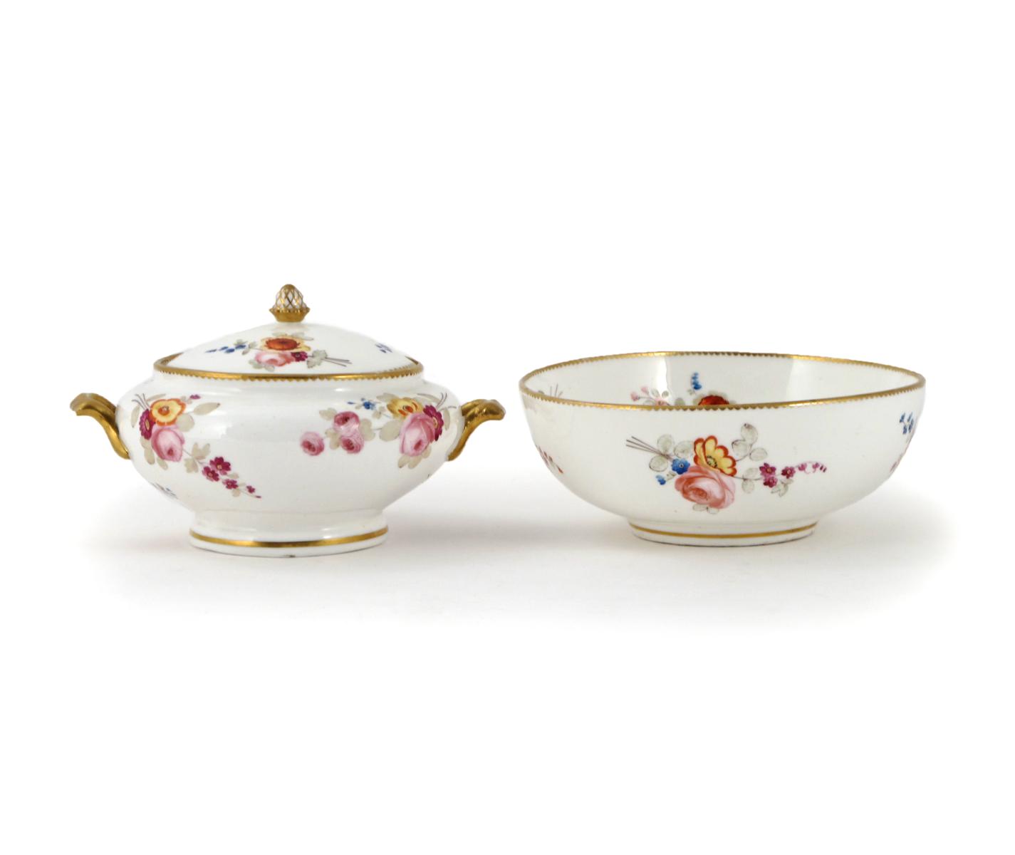A Nantgarw sucrièr and cover and a slop bowl c.1818-20, the sucrièr of compressed circular shape with twin handles and a pineapple finial, probably Welsh-decorated with simple floral sprays within gilt dentil rims, the slop bowl with identical decoration, 18.5cm max. (3)