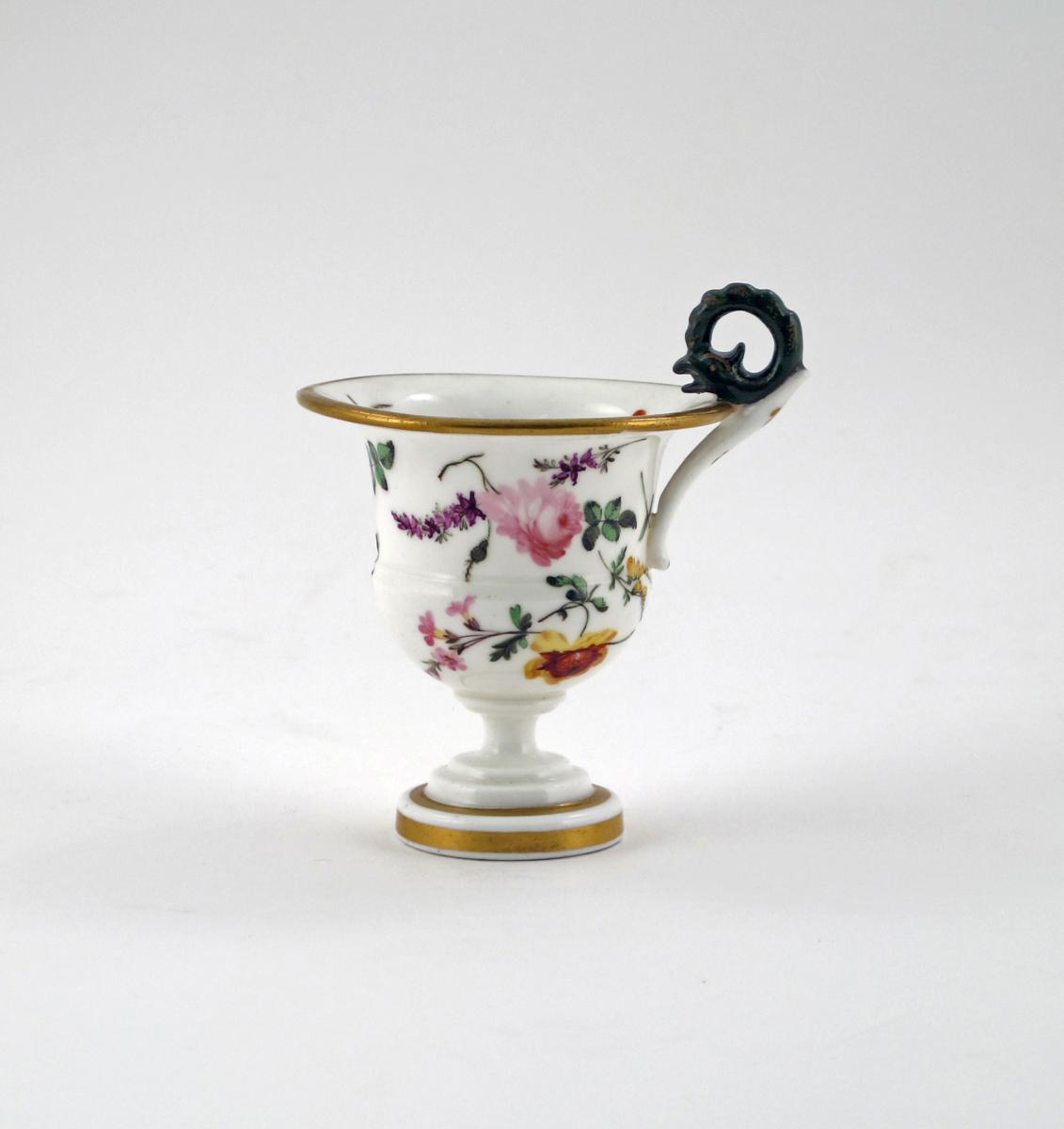 A rare Nantgarw specimen or cabinet cup c.1818-20, the bell-shaped bowl finely painted to the exterior and interior with loose flower sprays in the manner of William Billingsley, with griffon handle, raised on a stepped foot, 9.5cm.