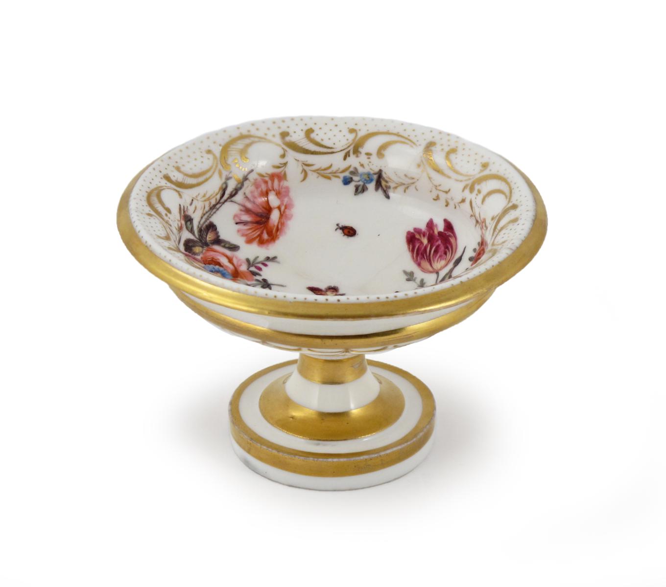 A rare Nantgarw small tazza c.1818-20, the shallow circular body with a turned rim and raised on a heavy turned foot, London-decorated with a butterfly and ladybird between two floral arrangements and further single scattered blooms, the exterior with gilt husk and garland borders, 11cm dia.