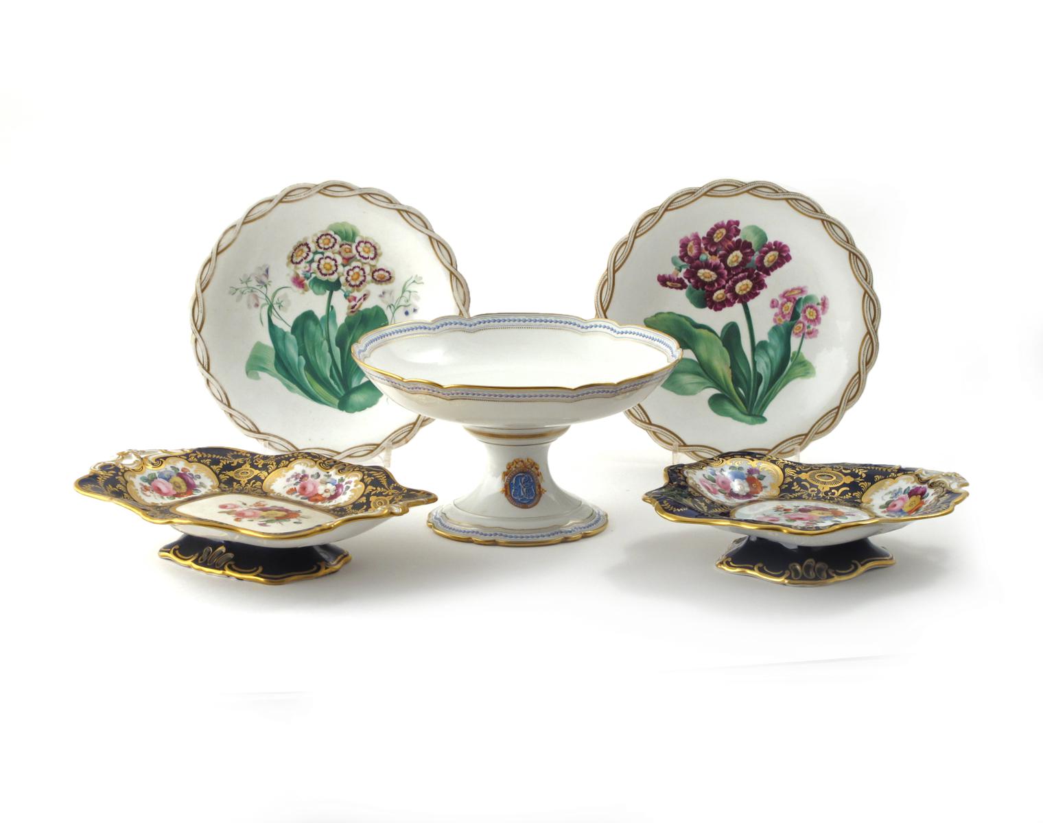 Two Davenport shaped dishes c.1840-60, painted with floral vignettes reserved on a blue ground, each raised on a low foot, a pair of English porcelain tazzae painted with botanical specimens in pattern 6838, and a Paris porcelain tazza with a monogram to the foot, 27.5cm max. (5)