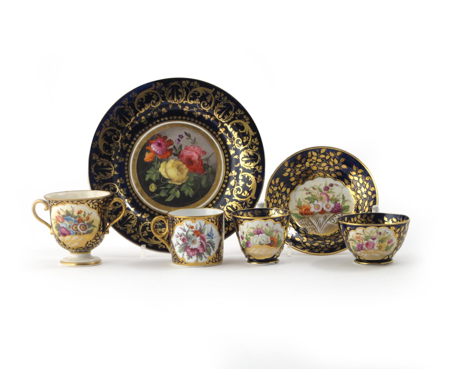 A Minton trio c.1830, decorated in pattern 876 with flowers issuing from gilt shell motifs reserved on a cobalt blue ground with gilt leaves, a matching coffee can, a two-handled Minton cabinet cup decorated in the similar pattern 780, and a cabinet plate painted with rose and peony within a gilt and blue border, a crack to the cabinet cup, 21.7cm. (6)