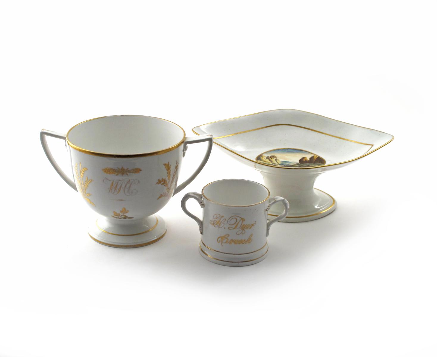 An English porcelain comport early 19th century, after Pinxton, painted with an oval panel of water amidst rocky hills, a large two-handled loving cup with a gilt monogram amid foliate sprays, probably Coalport, and a smaller loving cup with gilt inscription for 'H. Dyer Creech', 33.5cm max. (3)