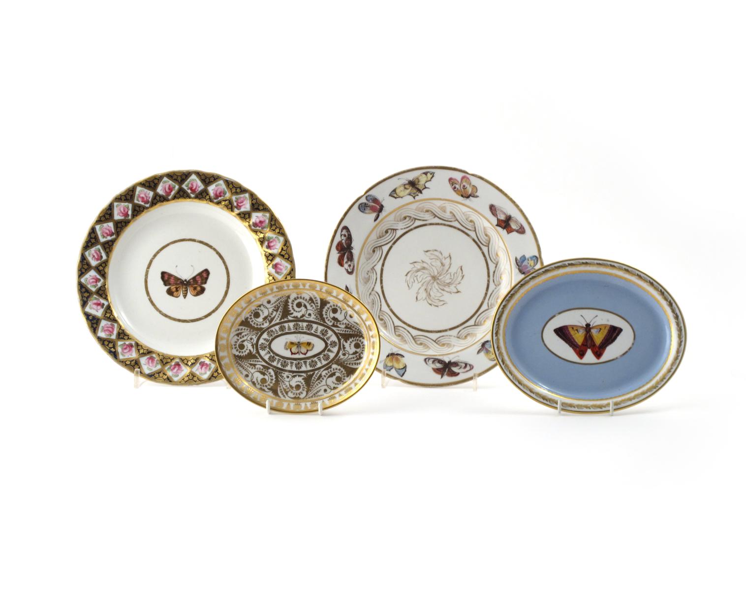 Two English porcelain plates and two teapot stands 1st half 19th century, variously decorated with moths and butterflies, one stand Spode in pattern 2158, a large moth reserved on a lilac ground, one probably Derby in pattern 742 on a gilt scroll ground, one plate Derby in pattern 352 with a border of pink roses, the other with various moths and butterflies to the rim, a gilt foliate motif to the well, 23.8cm max. (4)