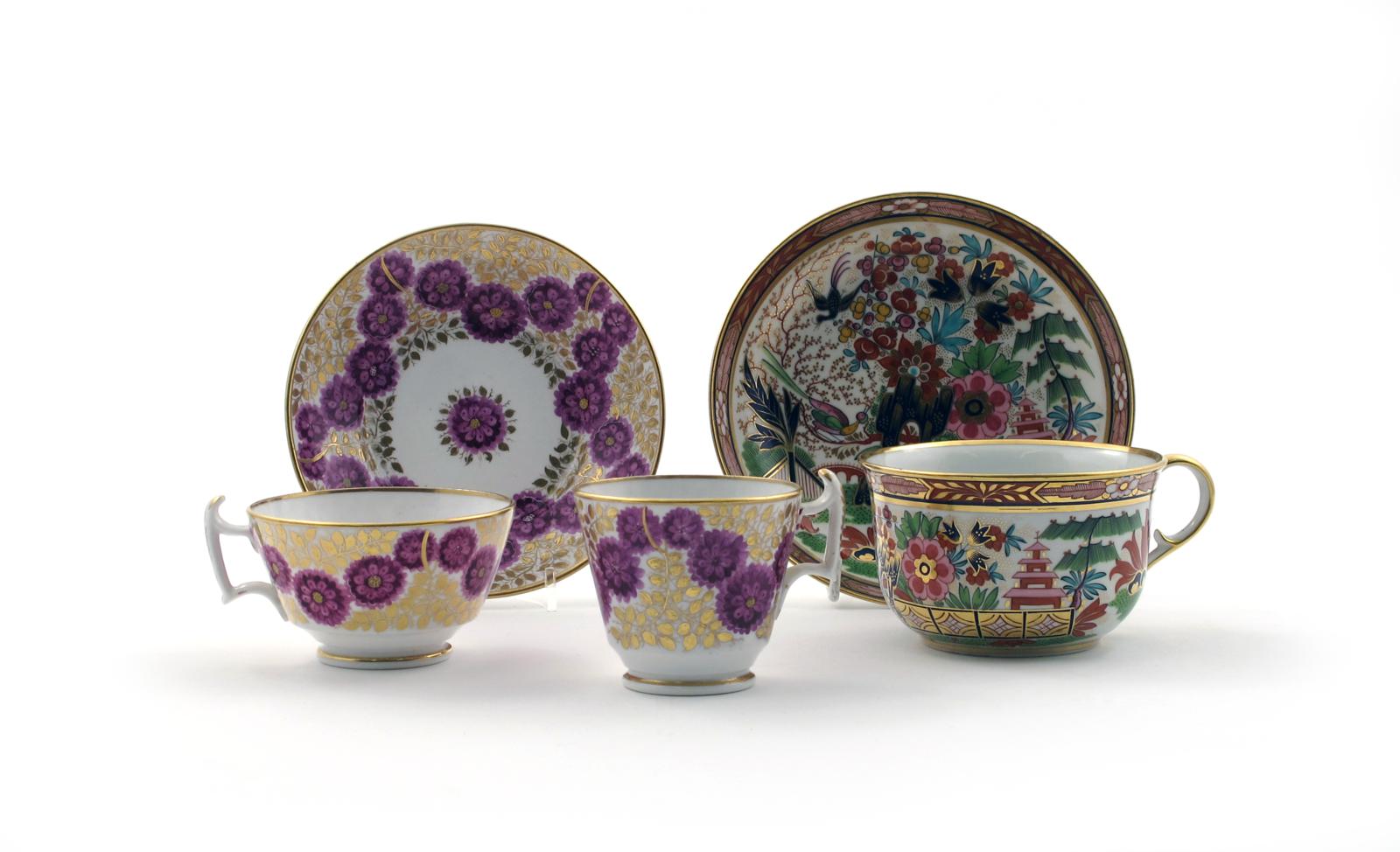 A Barr Flight and Barr Worcester breakfast cup and saucer c.1810, brightly decorated with an Imari type pattern of birds in an Oriental garden, impressed and printed marks, and a Derby trio decorated with a rich design of purple flowerheads on a gilt leaf ground, 16cm max. (5)
