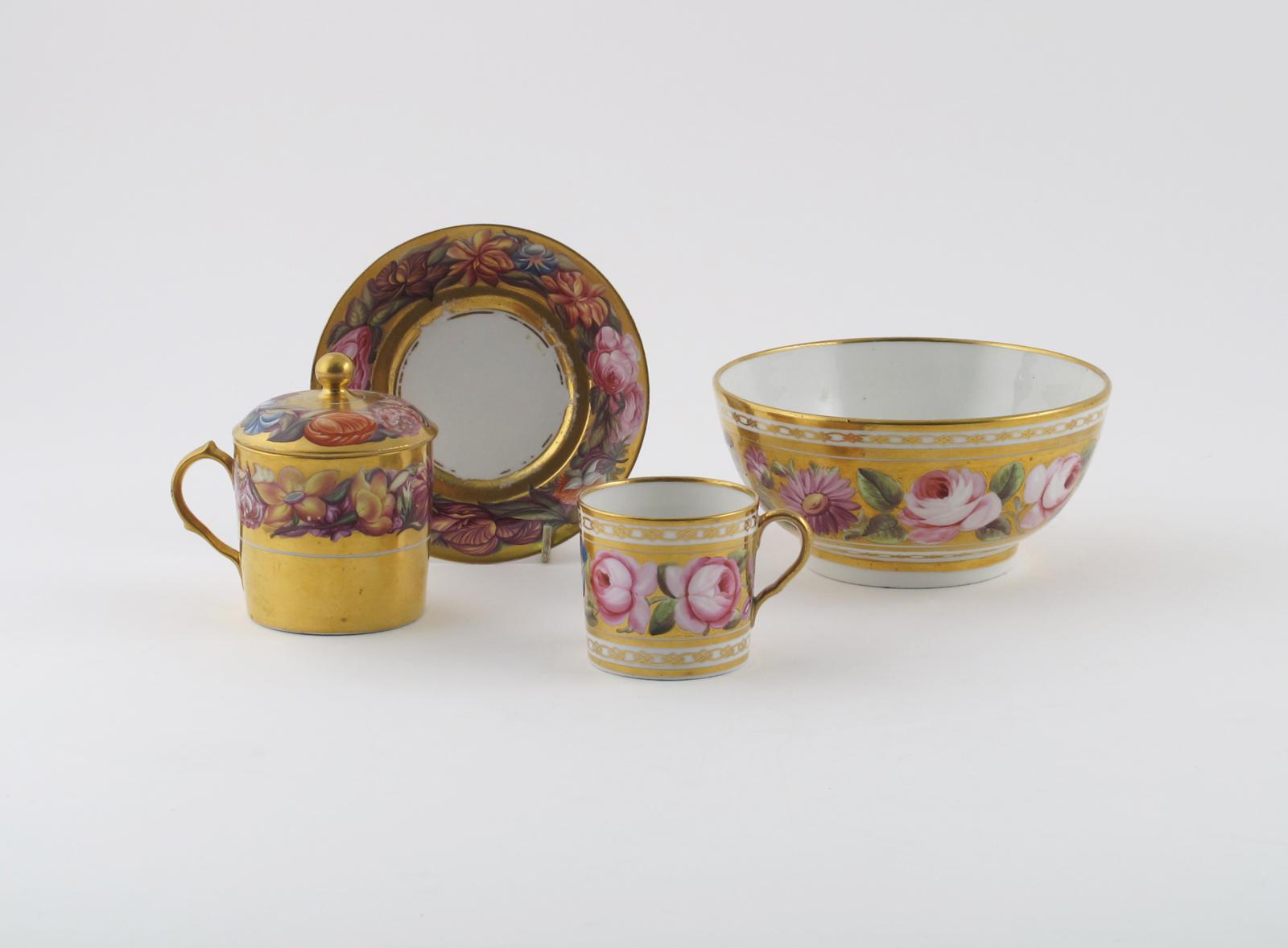 A covered cabinet cup and stand 1st half 19th century, richly decorated with a continuous band of flowers reserved on a gold ground, and a slop bowl and coffee can with similar decoration between chainlink bands, 16cm max. (5)