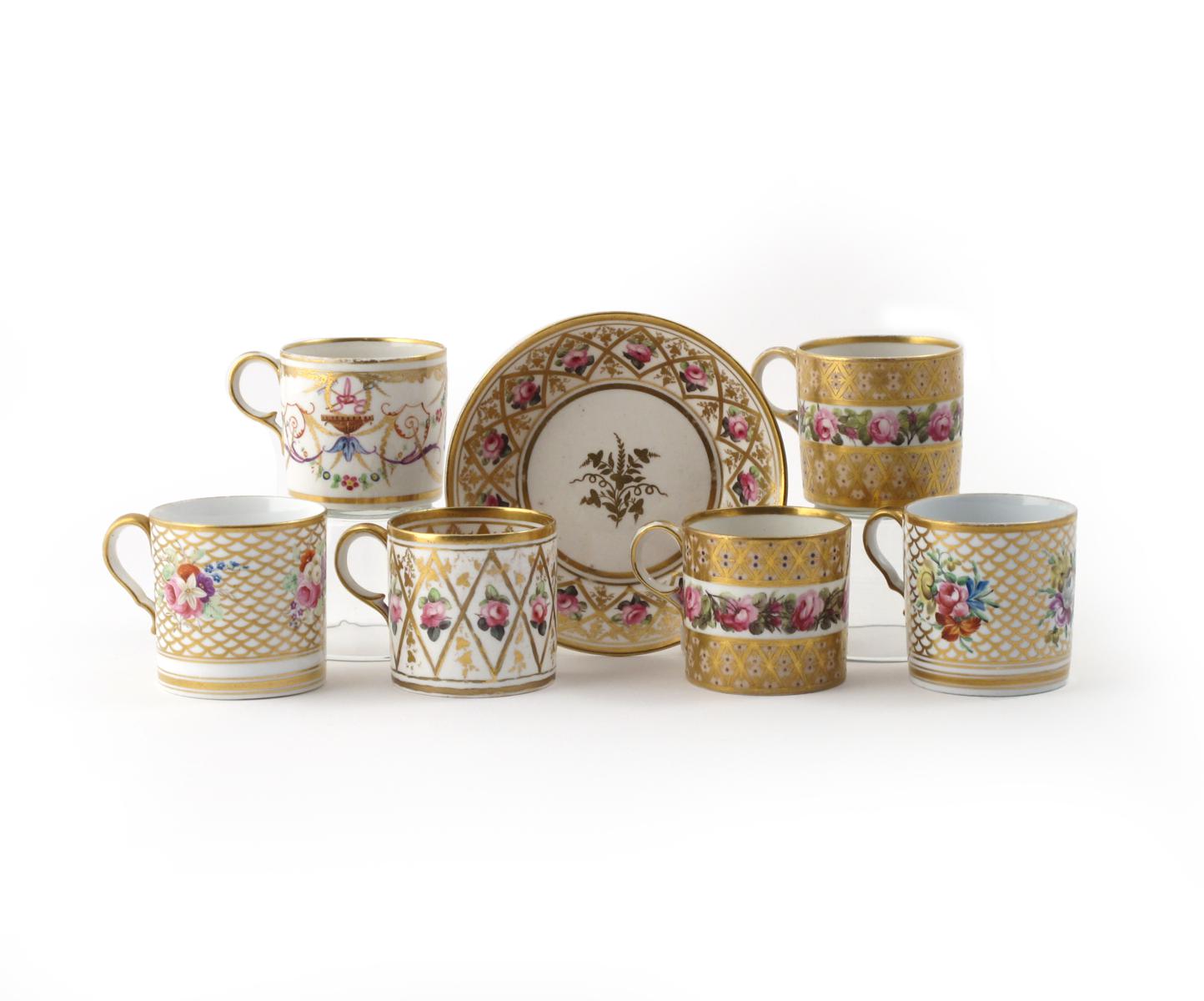Four Derby coffee cans and a saucer c.1800-10, two cans decorated in pattern 529 with a band of pink roses reserved on a salmon ground, one in pattern 576, the can and saucer in pattern 626, and two further coffee cans with floral arrangements against a gilt scale ground, puce factory marks to most, 13cm. (7)
