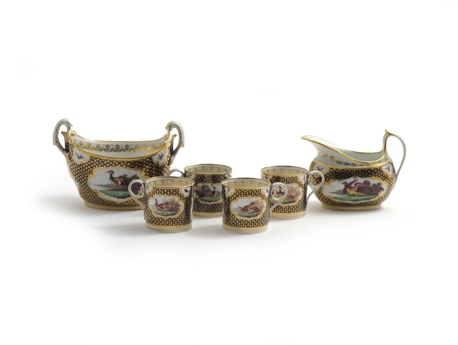 A combined Barr Flight & Barr and Spode part tea service 1st half 19th century, decorated in the Worcester manner with fancy birds and flying insects reserved within gilt cartouches on a blue and gilt scale ground. Comprising: a BFB milk jug, sugar bowl and coffee can, and three Spode cans. (6)