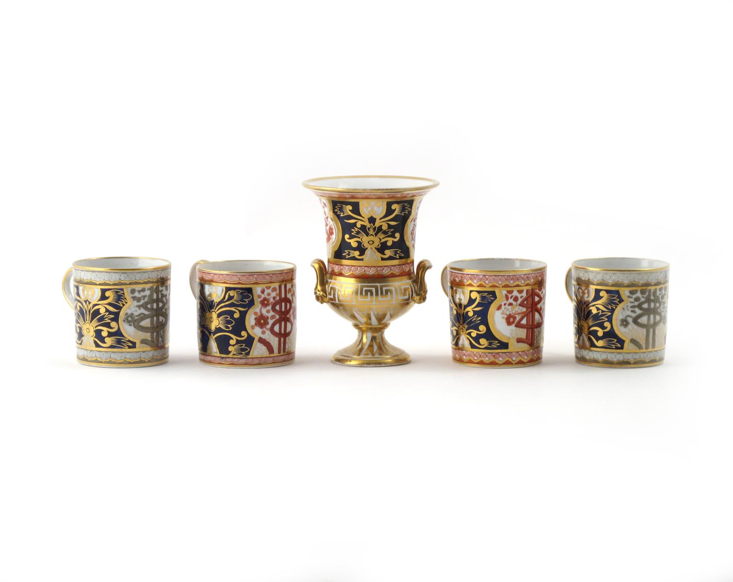 Four Coalport coffee cans and a small Spode vase c.1820, decorated in the Dollar pattern, two cans in an unusual pale green version, 12cm max. (5)