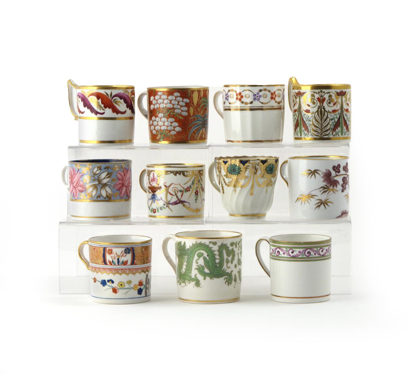 Ten English porcelain coffee cans 1st half 19th century, including Derby, variously decorated with foliate scrolls, floral bands, palm trees, chrysanthemum and Chinese dragons, and a Flight Worcester fluted coffee cup, 7cm max. (11)