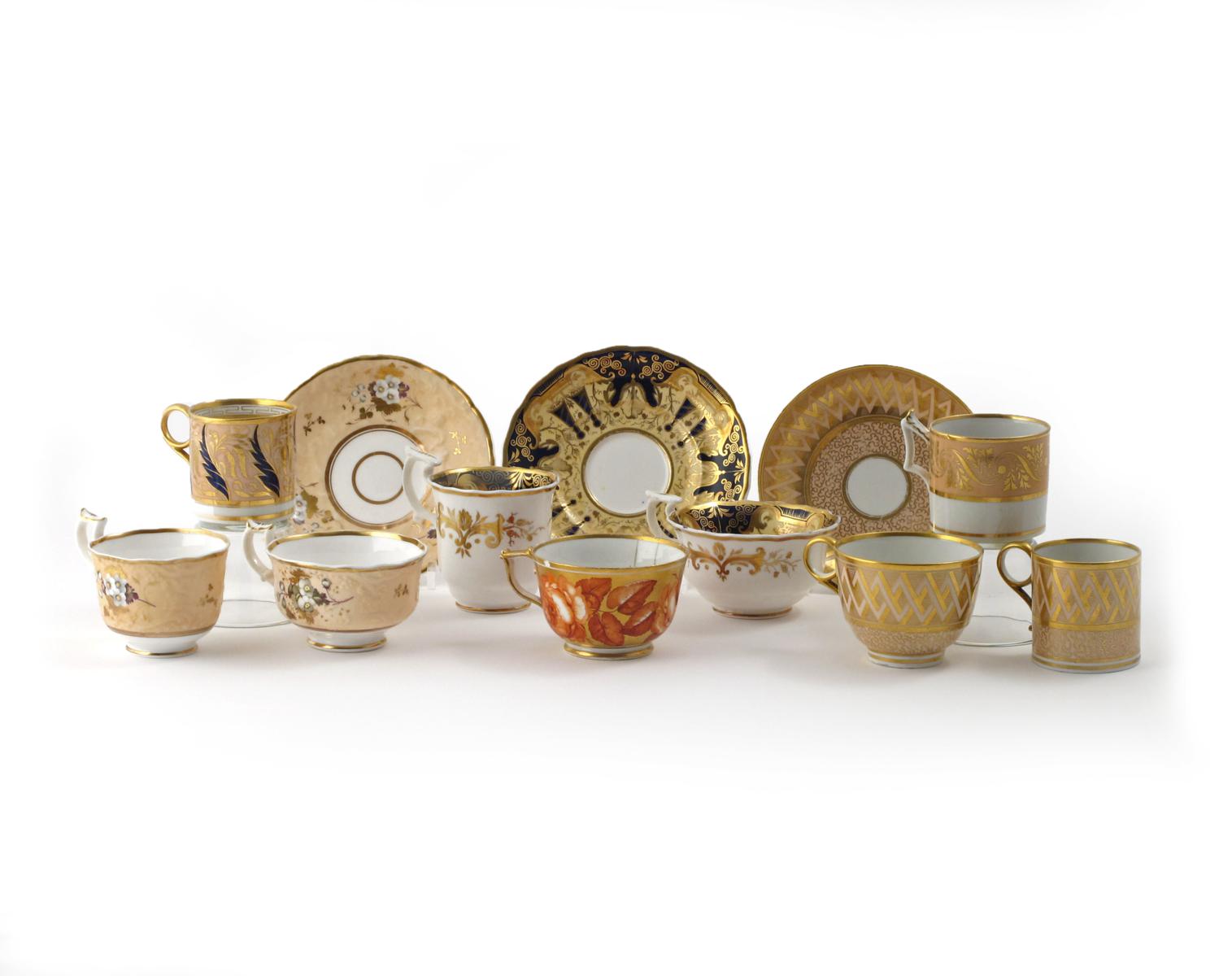 A Barr Flight & Barr trio c.1810, decorated with a wide gilt geometric band and vermicelli design on a pale peach ground, impressed marks, two other English porcelain moulded trios, a Barr Flight & Barr coffee can, a Flight Barr & Barr can, and a Derby teacup, the latter cracked, 15cm max. (12)
