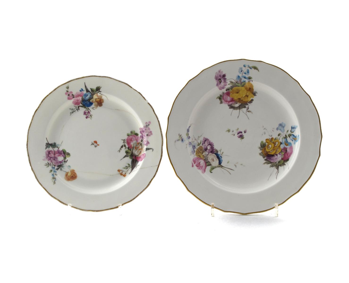 Two Derby plates c.1795, one painted by William Billingsley, each with three sprays of spring and summer flowers, within shaped gilt rims, puce factory marks and pattern number 80, painted 7 inside the footrim, the smaller damaged, 24.5cm max. (2)