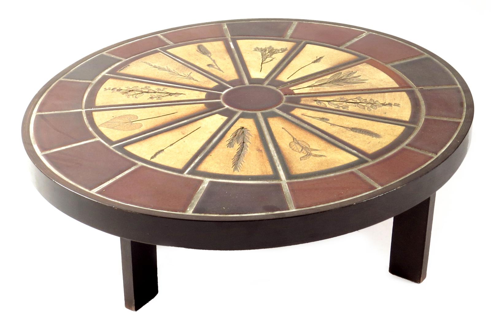 A Roger Capron tile topped table, elliptical section the tiles impressed with leaf design, impressed signature
