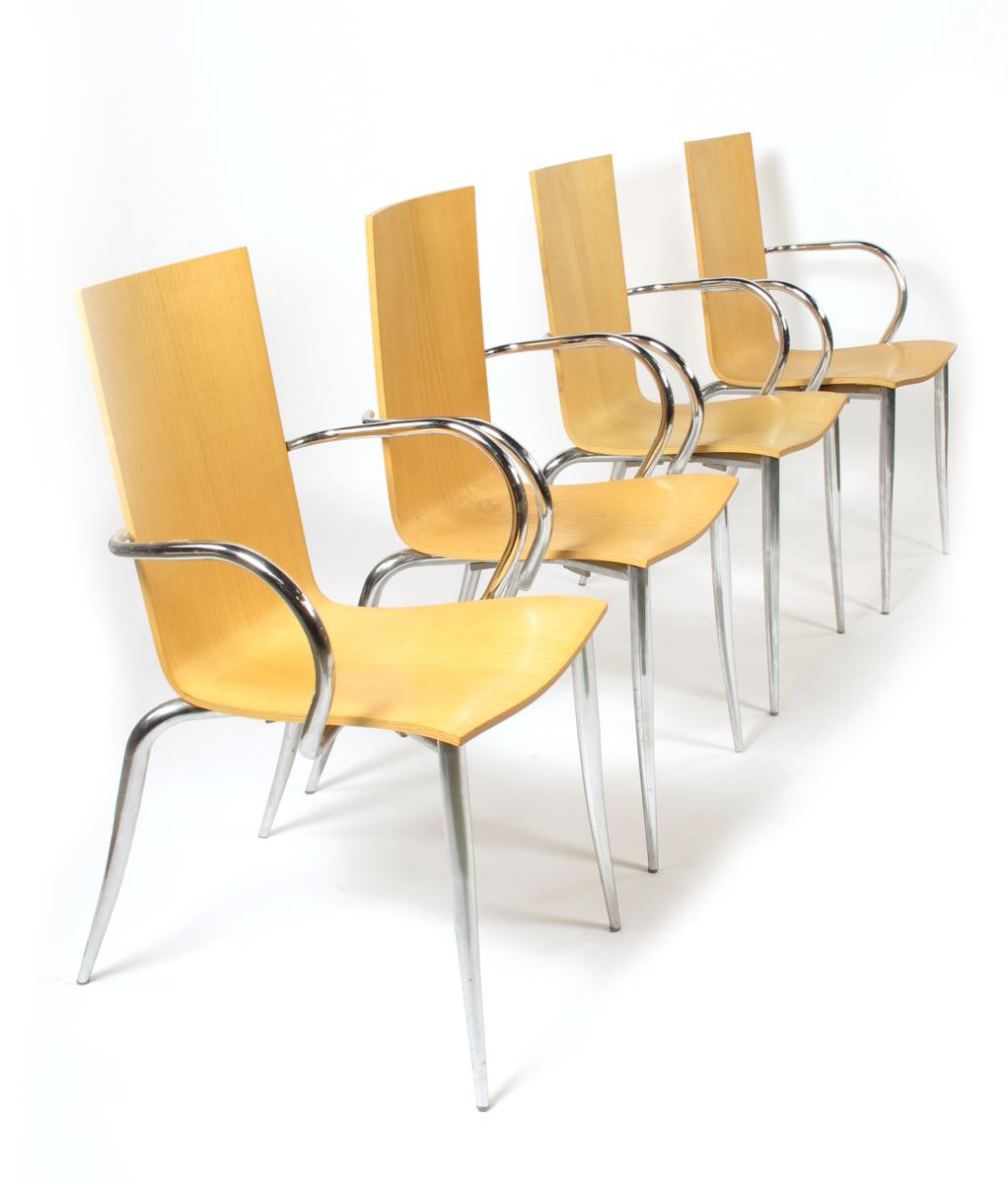 A set of four Driade bent ply and chromed steel chairs, designed by Phillipe Starck, impressed marks, stamped 28F 90cm. high
