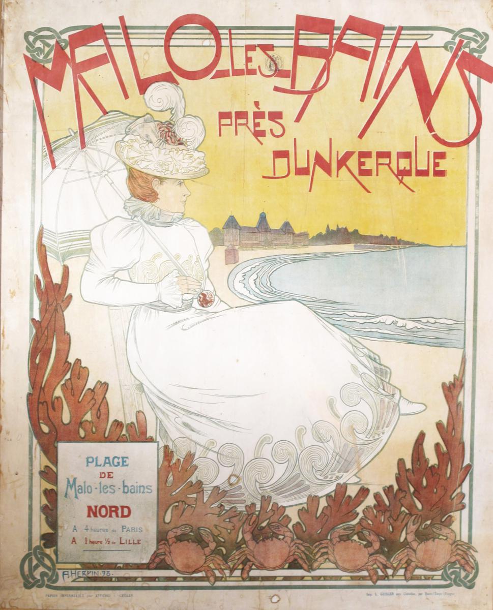 'Malo Les Bains' a lithographic poster designed by A Herpin, 1898, printed in colours by L Geisler, mounted on board, framed signed in the print image 103 x 84cm.