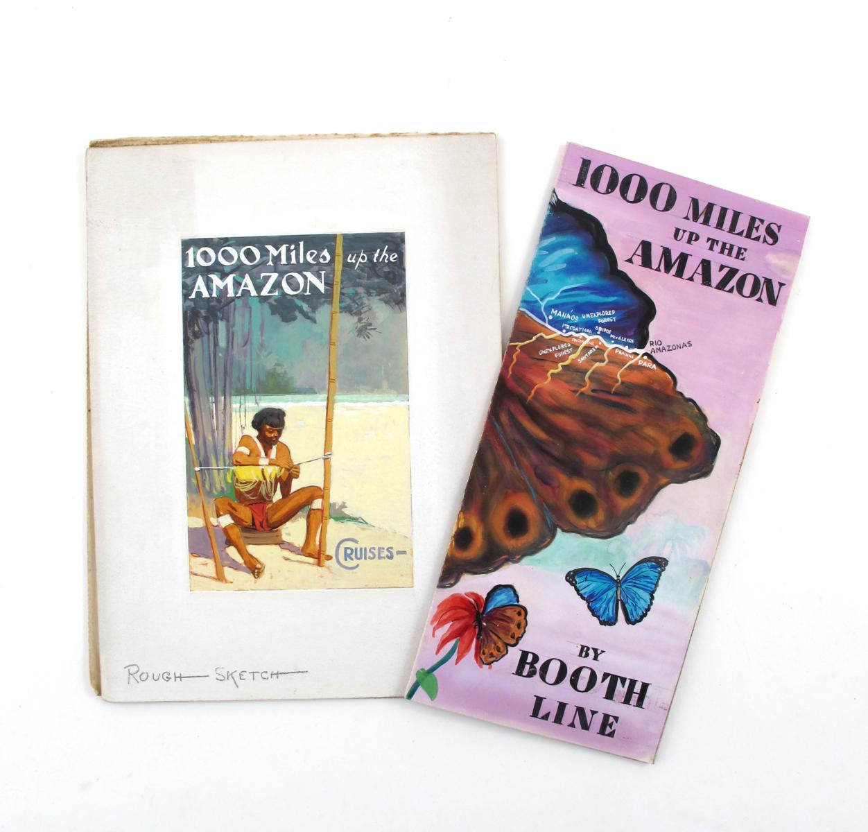 '1000 Miles Up The Amazon - Cruises' an original artwork design by Charles Birchall Ltd, and an original artwork design for a Booth Line brochure by the same hand applied paper label main image 14 x 9cm.