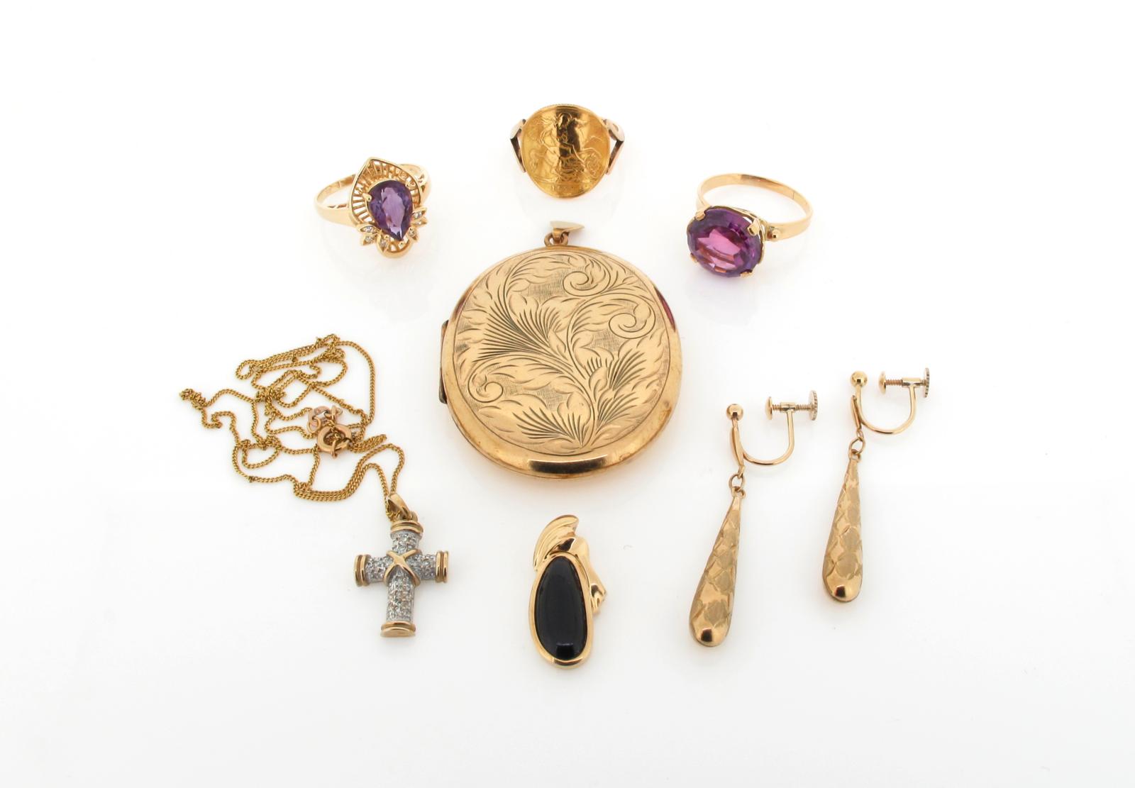 An engraved oval locket pendant, 22g in total. With three gold rings, a pair of gold baton drop earrings, a black stone set gold pendant and a cross pendant set with small diamonds on a fine link gold chain.