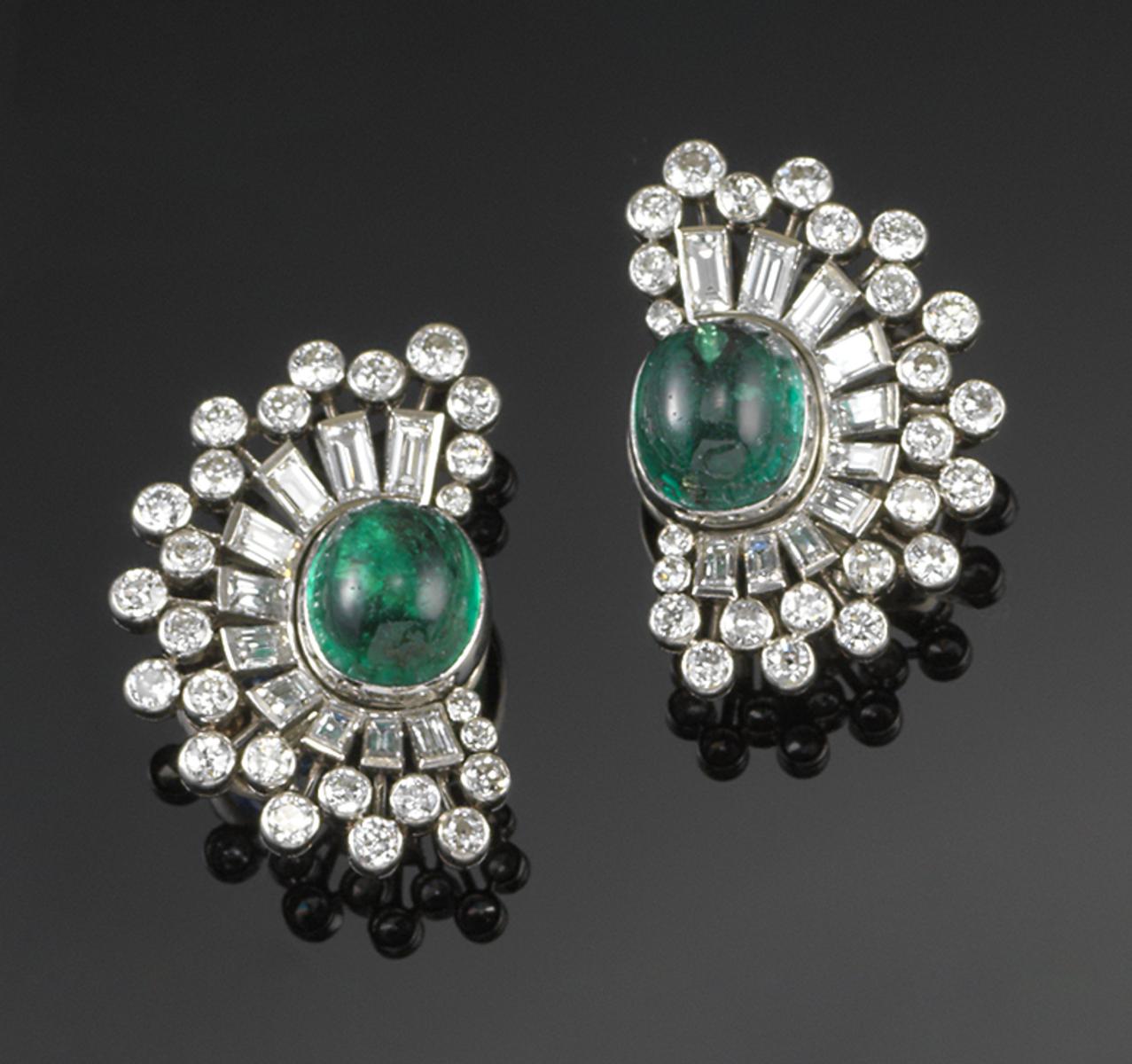 A pair of French emerald and diamond ear clips, C1950. Each earring centred with a cabochon emerald within a half border of baguette shaped diamonds and further surround of circular cut diamonds in platinum. French control marks and rubbed makers lozenge.