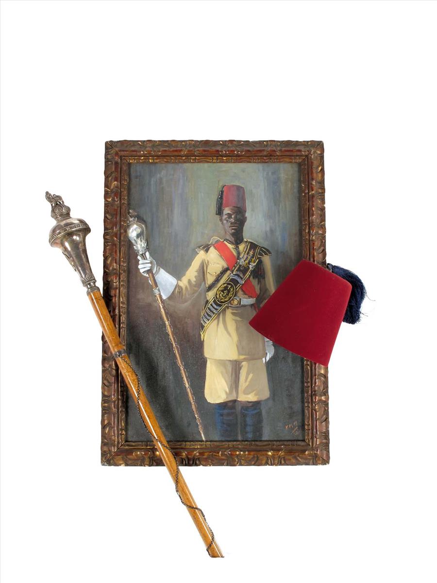 An oil painting of an Askari, signed lower right with initials 'K M M' and dated '1931', 27¾ x 17½in (70.5 x 44.4cm), in a glazed carved giltwood frame, together with the Askari's felt Fez and ceremonial mace inscribed 'NORTHERN TERRITORIES CONSTABULARY GOLD COAST' and 'HAWKES & SONS MAKERS 23937', 69in (175.3cm) long. (3)