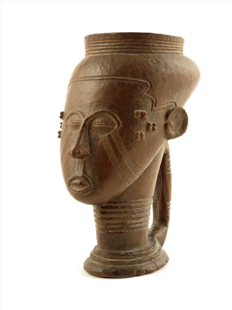A Kuba wood cup, with a reeded rim and a head with relief scarifications and an interlaced knot to the reverse, above an open handle and stepped base, paper label inventory number 3304, 7¾in (19.6cm) high.