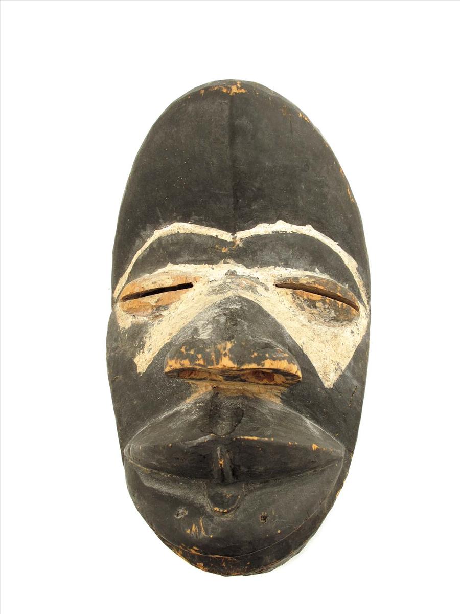 A Dan mask, with an ebonised patina with white across the coffee bean eyes, above wide nostrils and a lips with a small tongue, white inventory number 18, 9in (23cm) high.