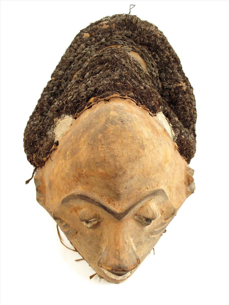 A Pende mask, with an applied cloth and fibre headdress, with a carved wood face with check scarifications with an ochre ground with ebonised and white pigment highlight, with a fibre beard, white inventory number 19, 14in (35.6cm) high.
