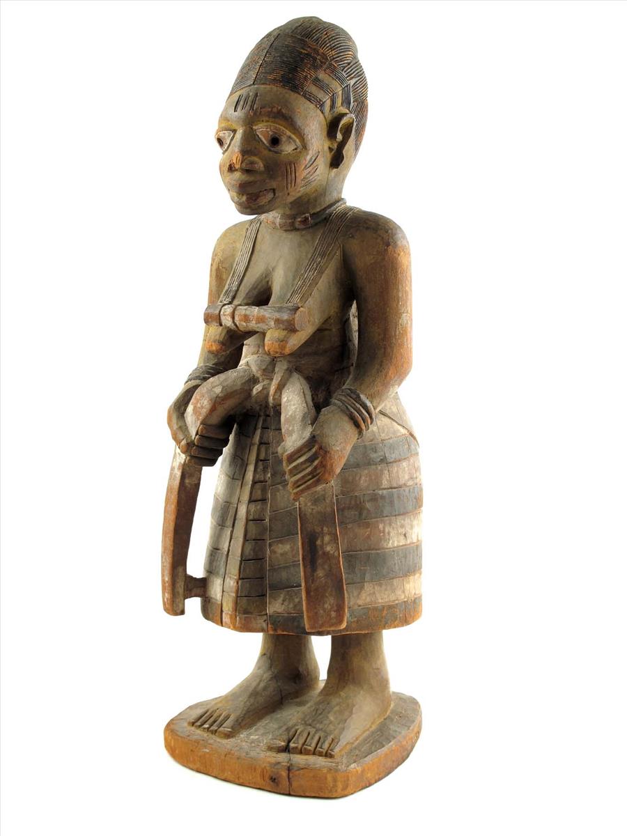 A Yoruba carved wood standing female figure with child, part ebonised with white pigment, with stylised coiffure with clasp to reverse, with a bar strap supported on her breasts and with a knotted sash around her waist with her hands palm and knuckle side on, her child with a single flat crest coiffure and with a strapped triangular pendant, with bead necklace (loose), with inventory number 16, twice and inscribed SEALY, 23in (58.5cm) high.