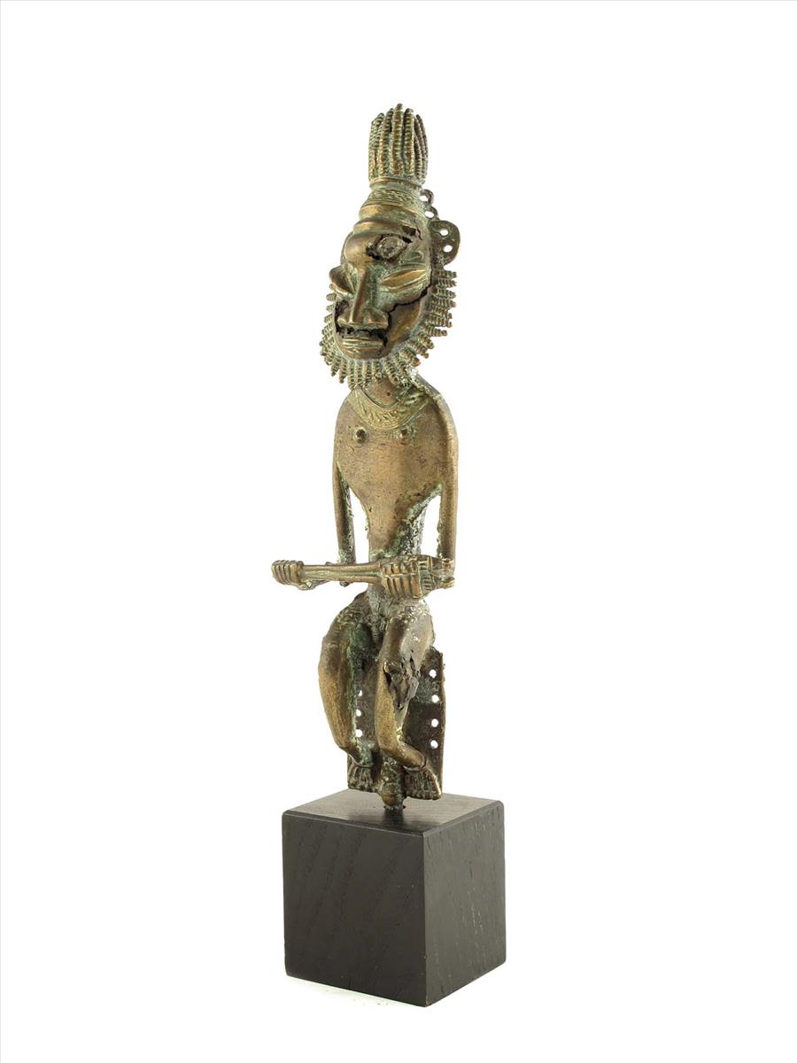A Yoruba brass edan staff, cast as a seated male holding a pair of rods, his head with tight curl beard and coiffure, with piercing for bells, the rectangular support with similar piercings and inventory number 299, on an iron rod, 12¾in (32.5cm) high, on a later stand. (2)