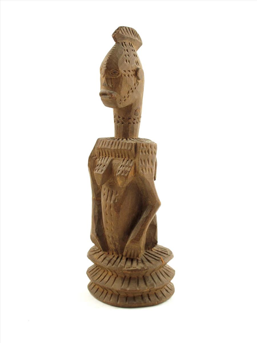 An Idoma wood maternity figure, River Confluence Valley, with allover chip decoration, with a single crest coiffure and pouting lips, her back with a child having two pair of arms, white inventory number 281, remains of a handwritten paper label and black inventory number 34, 12in (30.5cm) high.