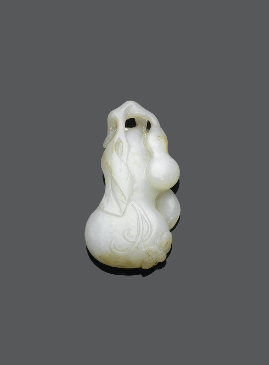 A Chinese white jade carving of a gourd 18th/19th century, the large fruit issuing from a gnarled leafy stem with another smaller fruit to one side, an insect climbing beneath delicate tendrils, 6.2cm.