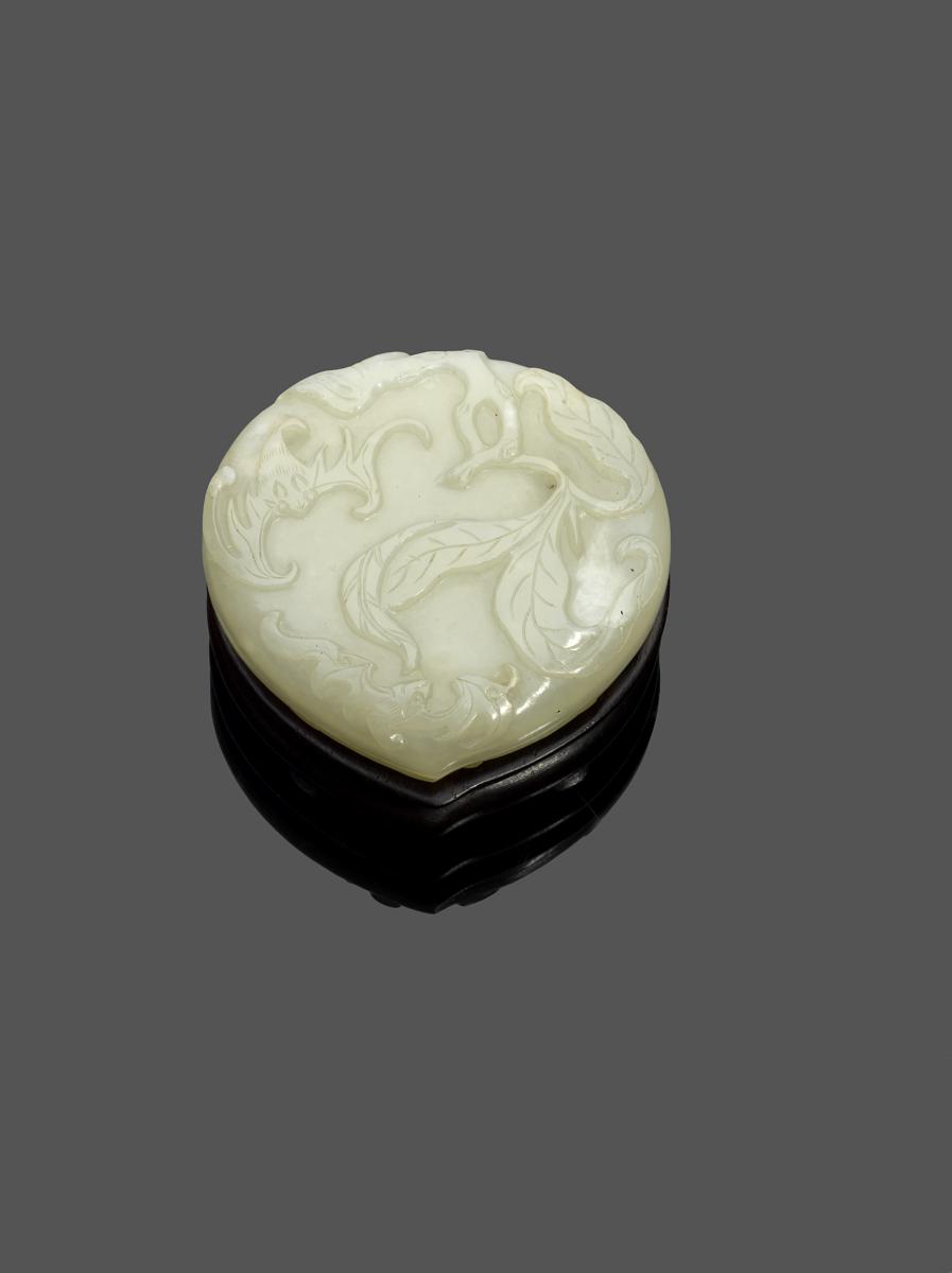 A rare Chinese pale celadon jade snuff box and cover Qianlong 1736-95, formed as a peach and finely carved to each side with a leafy branch issuing from the stem, and with two bats clambering upon the fruit with outstretched wings, a fitted hardwood stand, 5.4cm. (3)