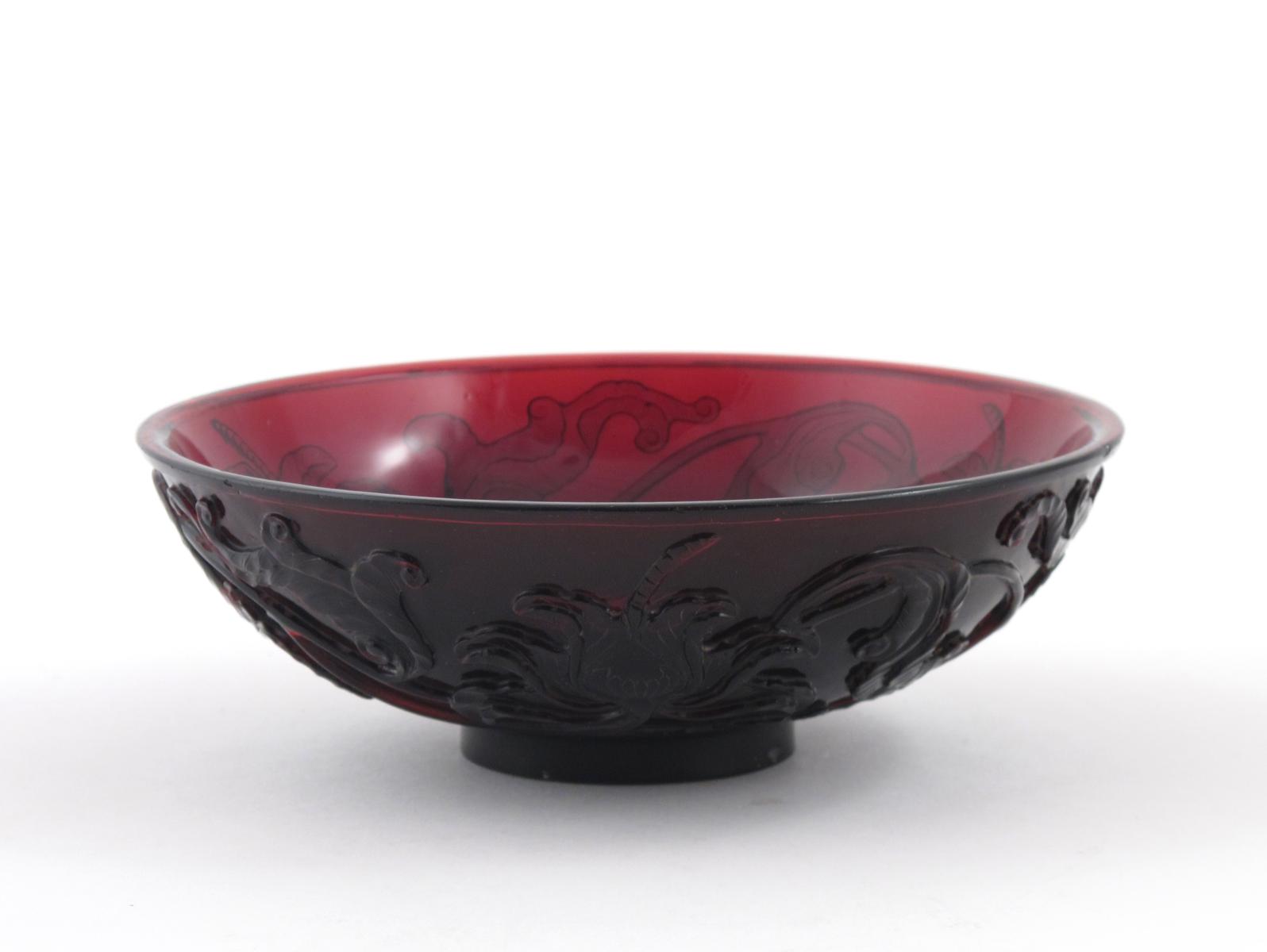 *A Chinese ruby red Beijing glass bowl four character Qianlong mark and of the period 1736-95, carved in relief to the exterior with scrolling hibiscus flowers and foliage, the body raised on a short circular foot, the glass a deep rich tone, 17.5cm.