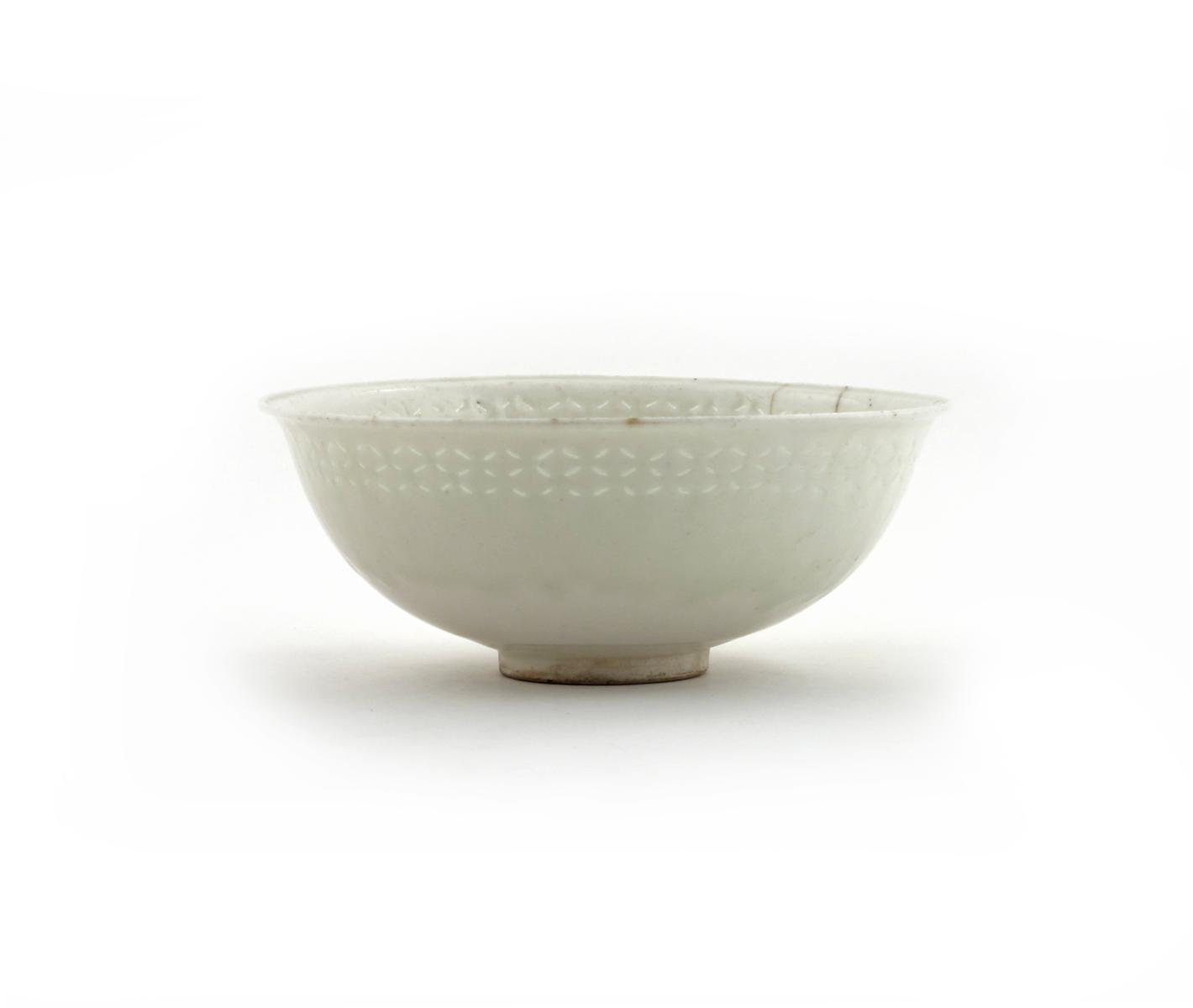 A rare Iranian Gombroon ware bowl 17th/18th century, with an everted rim and decorated with a border design of pierced lozenges, all beneath a white unctuous glaze, 21.3cm.