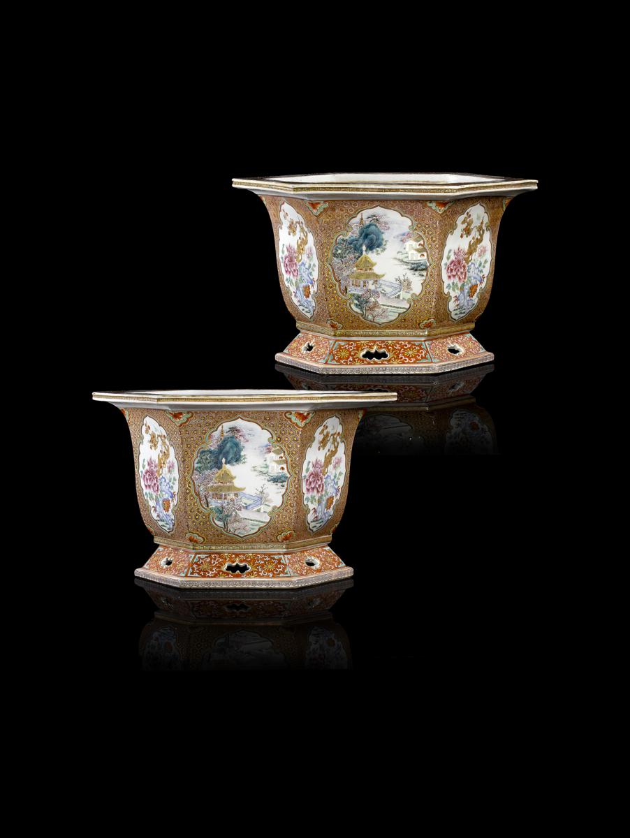 A pair of large Chinese famille rose hexagonal jardinières 18th century, brightly painted with panels of landscapes with pagodas and rocks divided by chrysanthemum, peony and prunus, all on an iron-red gilded cell-diaper ground, 47cm across. (2)